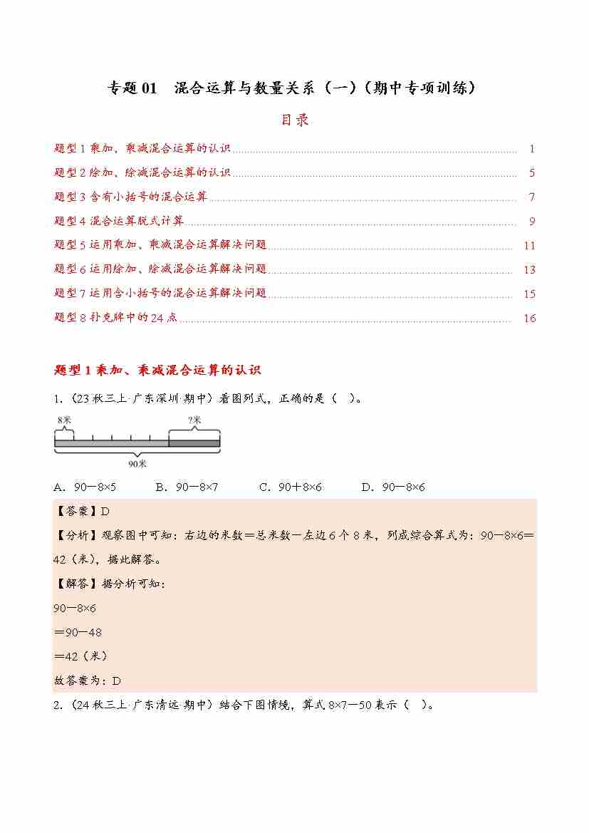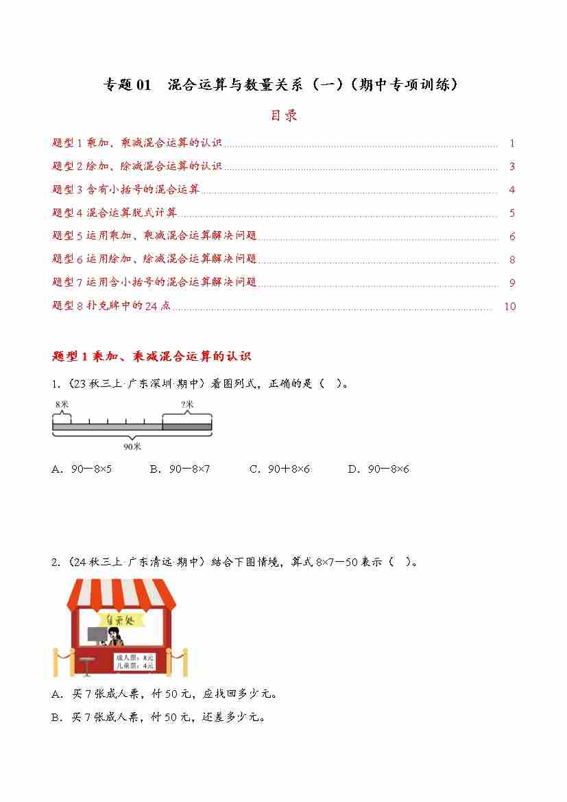 专题01 混合运算与数量关系(一)(期中专项训练)三年级数学上学期(原卷版)(苏教版)
