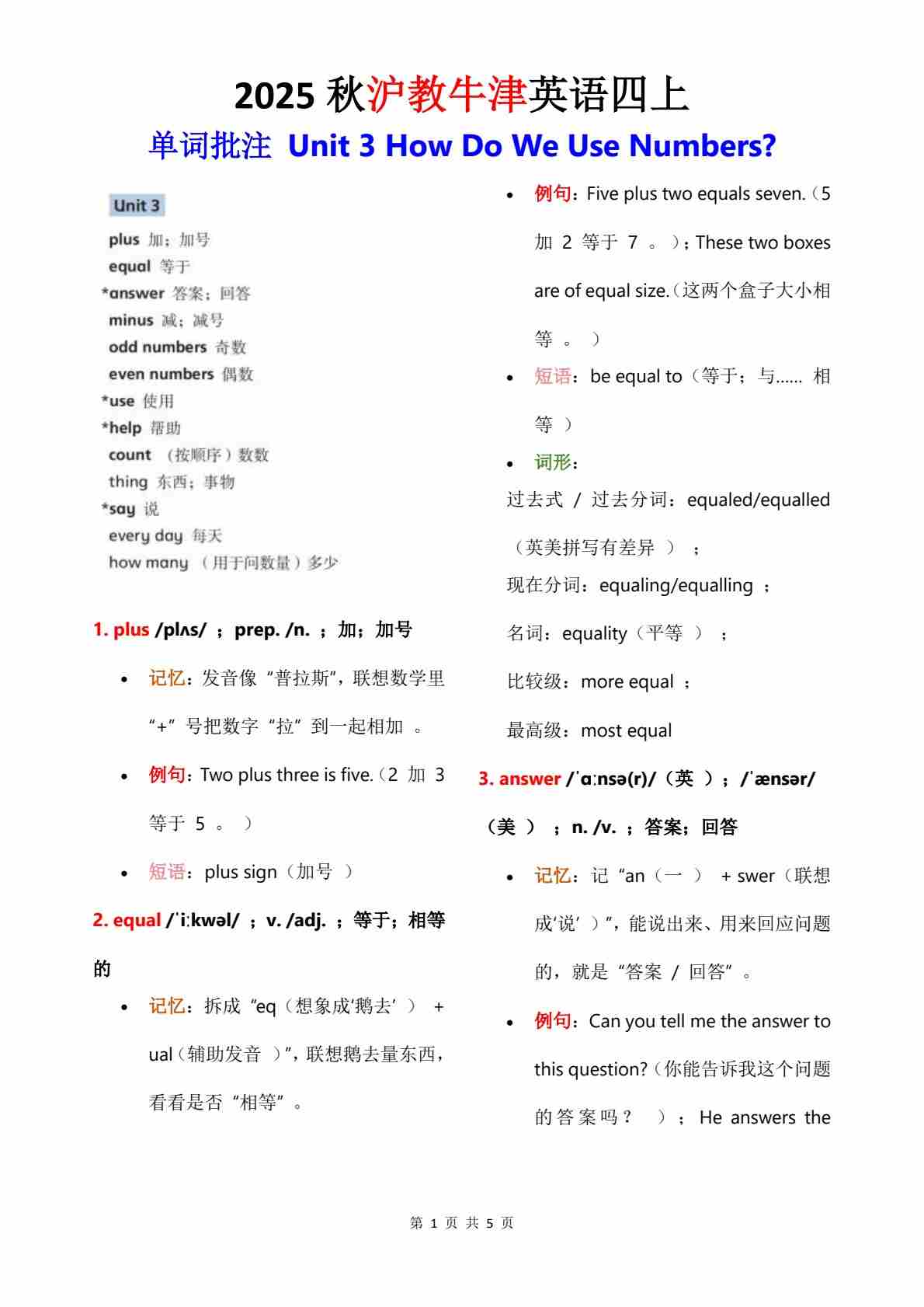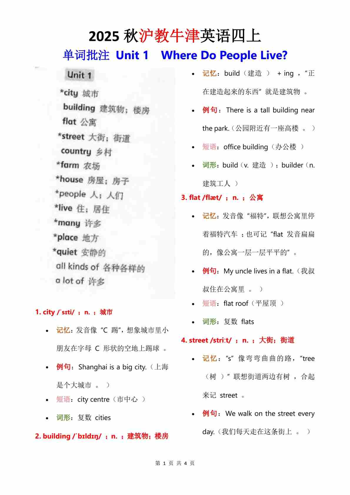 2025 秋沪教牛津版英语四上 单词批注 Unit 1