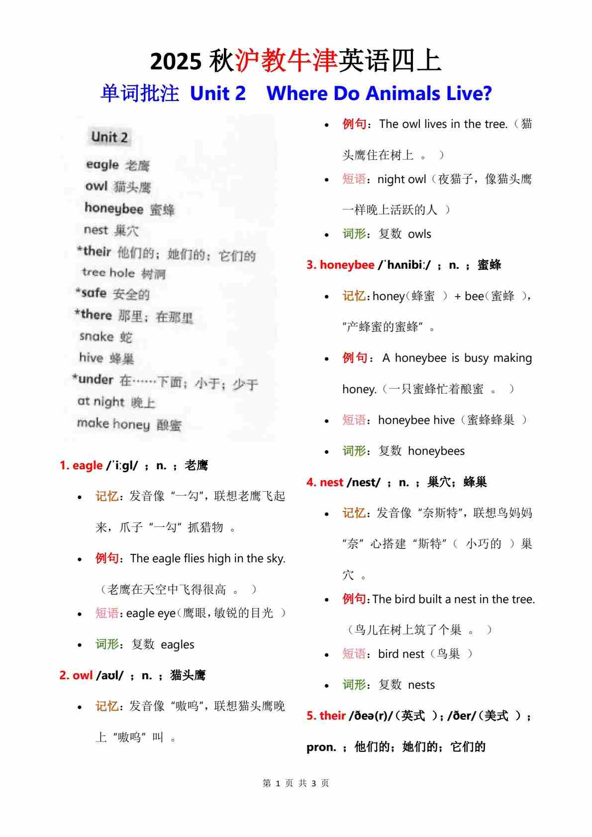 2025 秋沪教牛津版英语四上 单词批注 Unit 2
