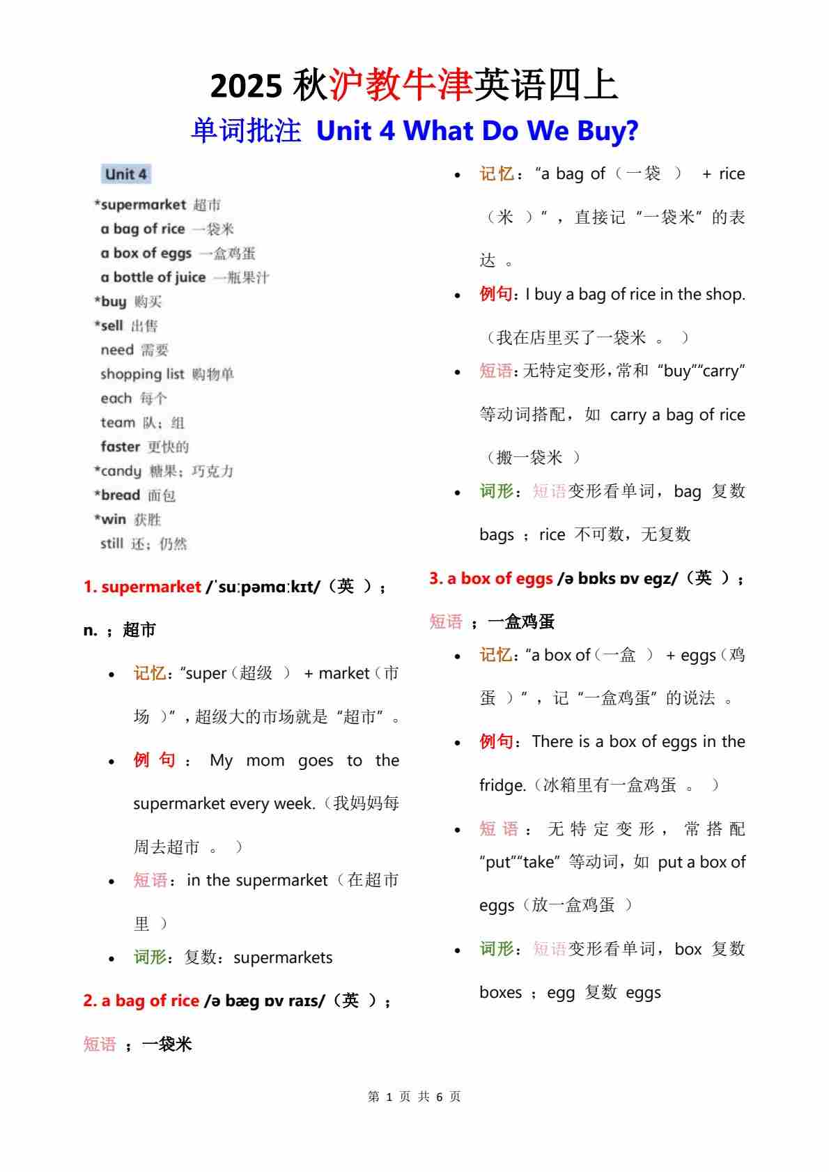 2025 秋沪教牛津版英语四上 单词批注 Unit 4