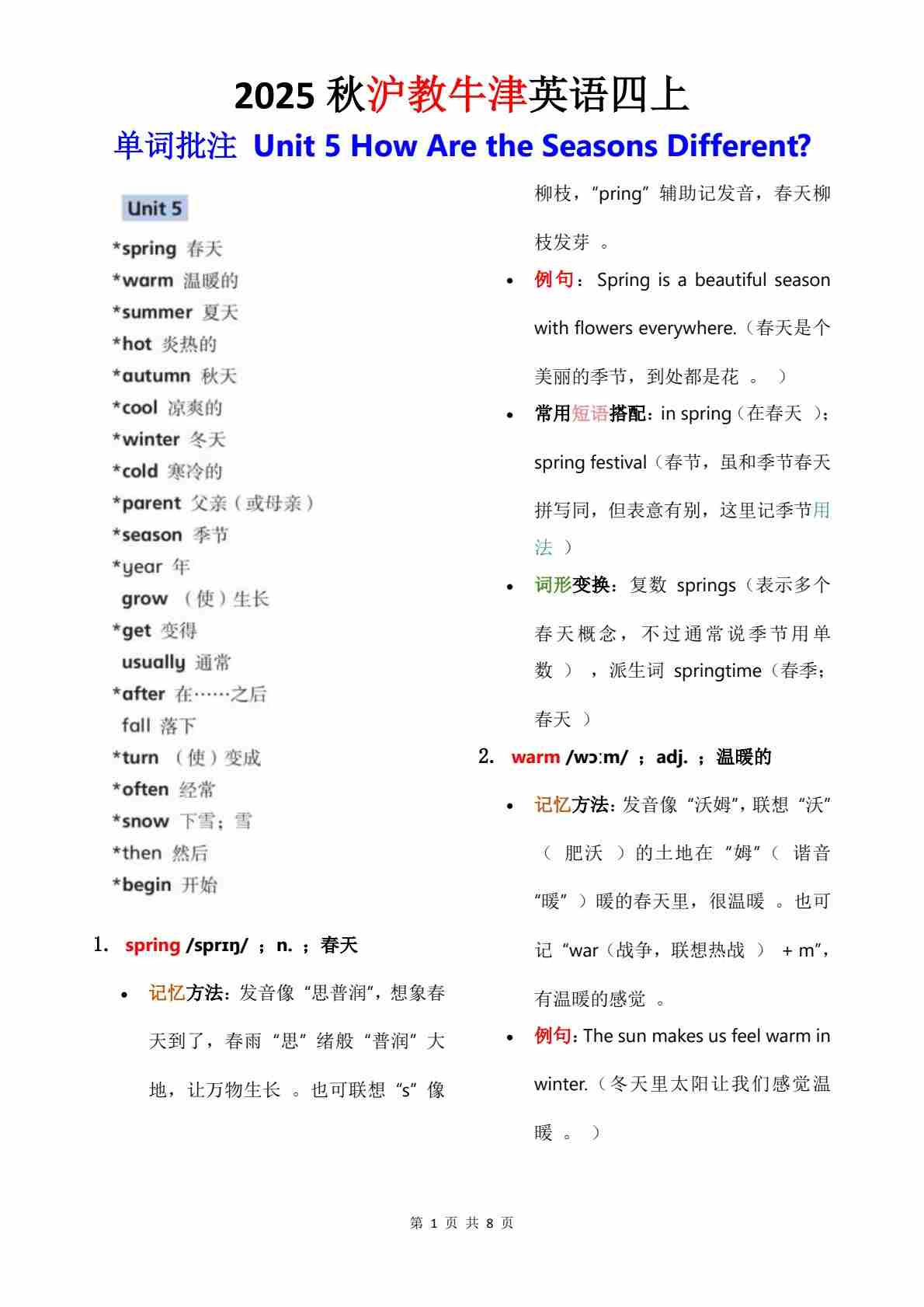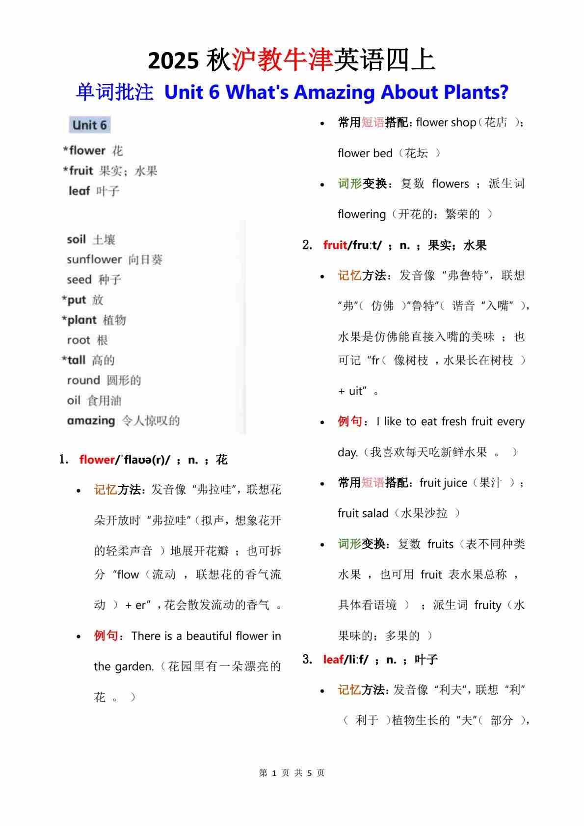 2025 秋沪教牛津版英语四上 单词批注 Unit 5