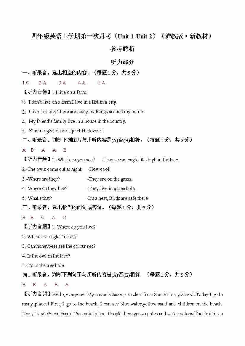 四上沪教第一次月考(Unit1-Unit2)(参考解析)