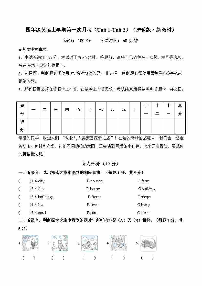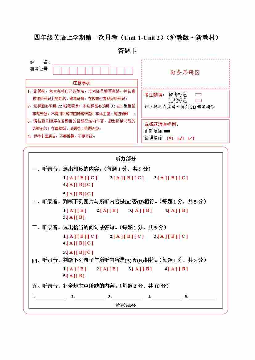 四上沪教第一次月考(Unit1-Unit2)(答题卡)