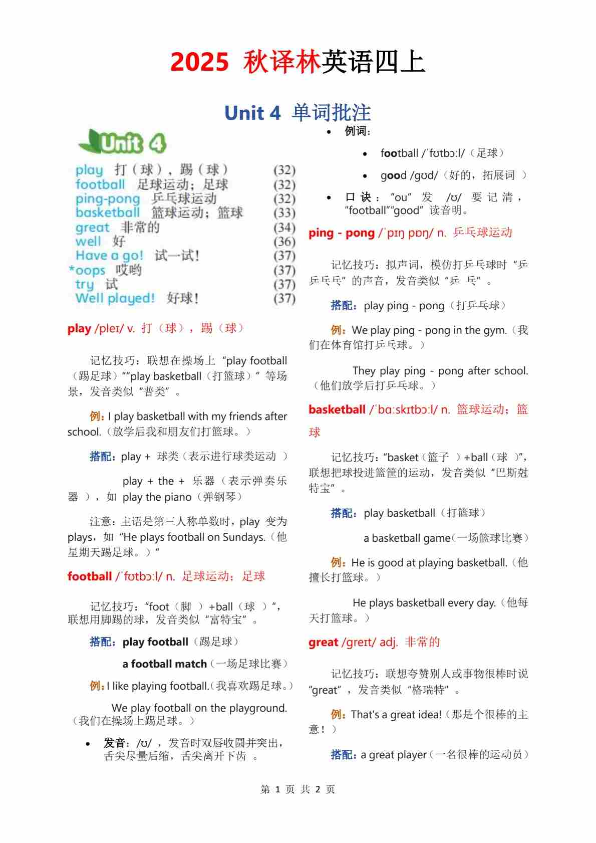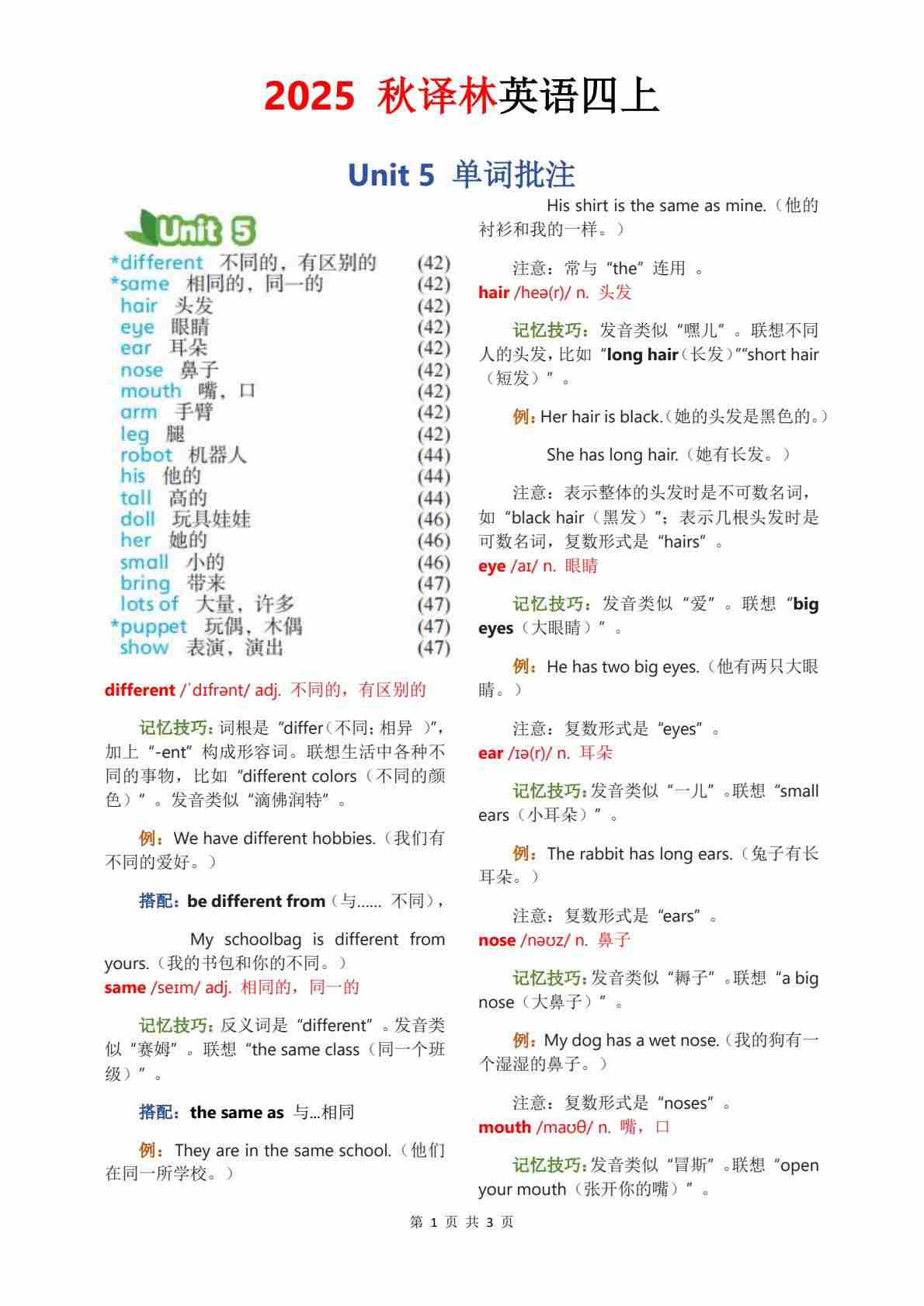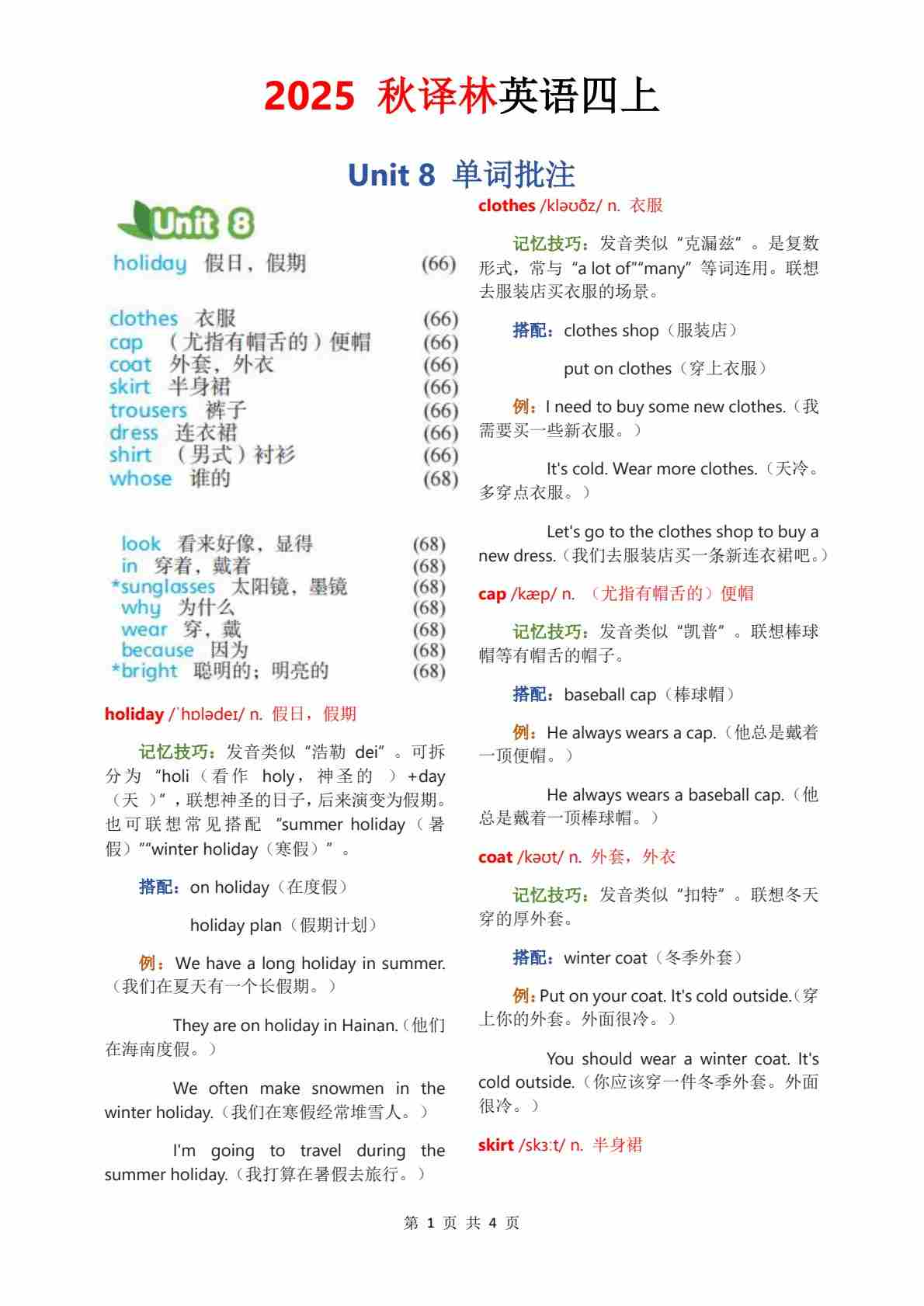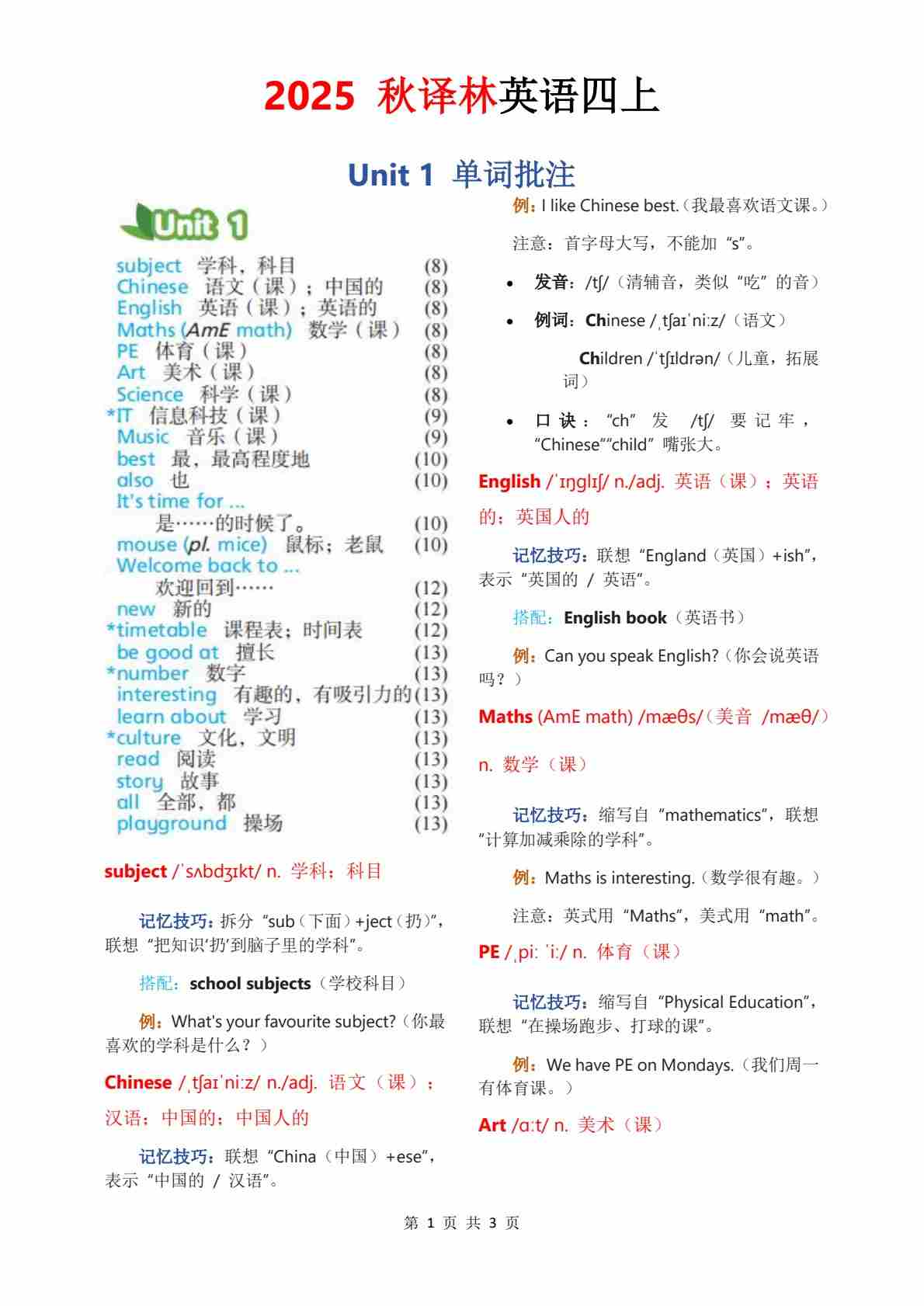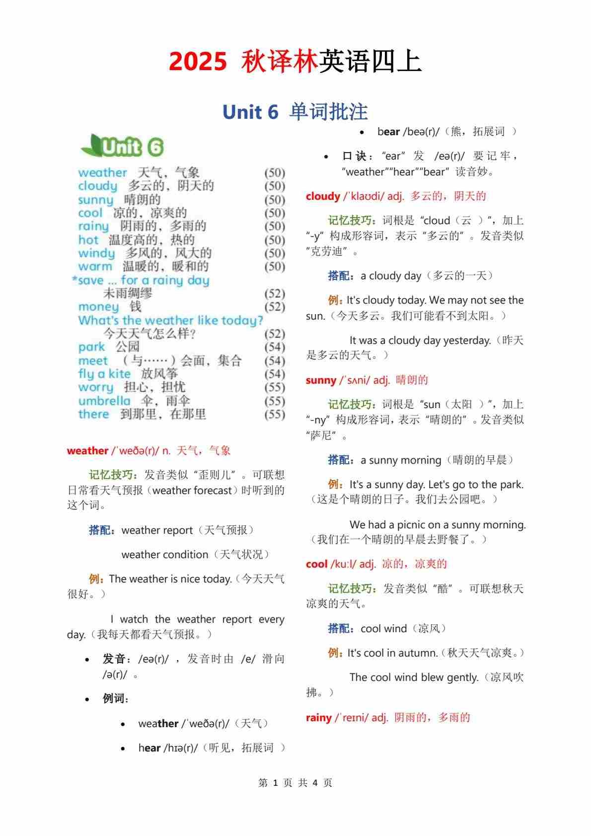 2025秋译林四上单词批注Unit 1