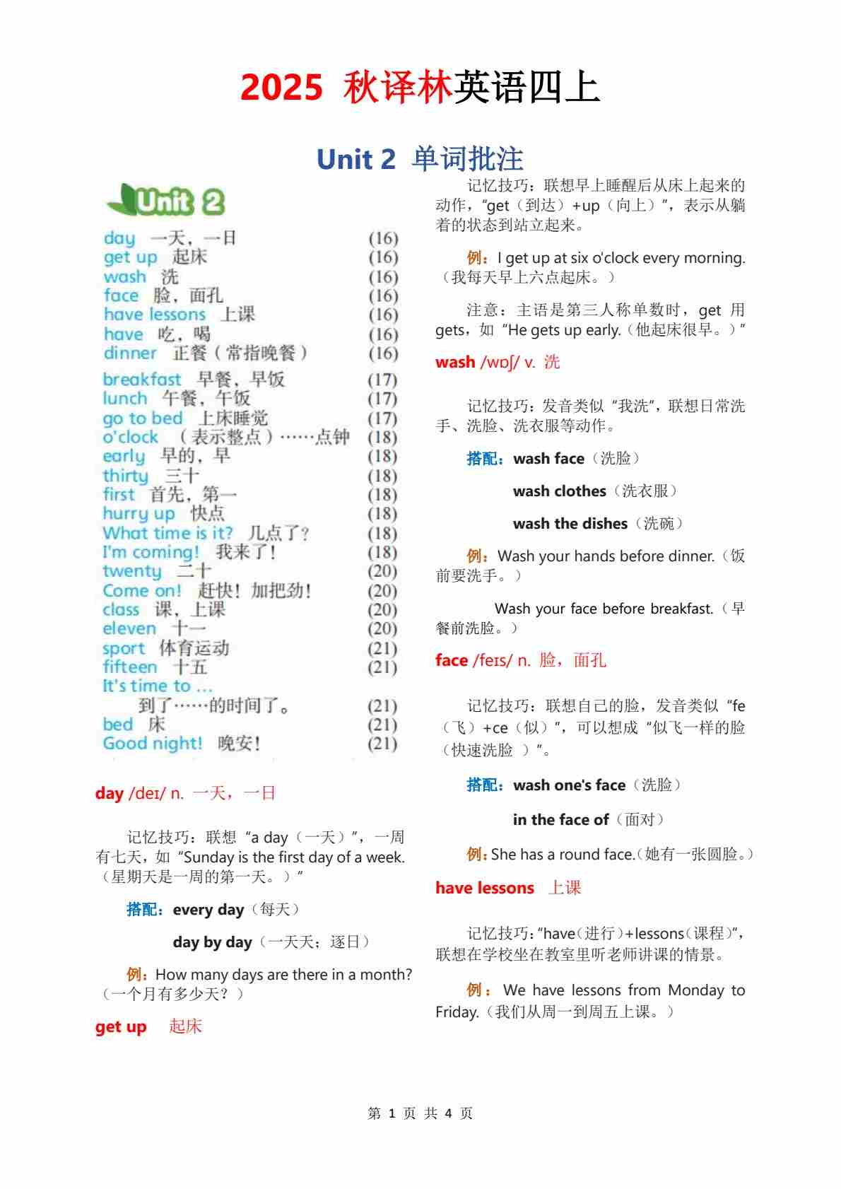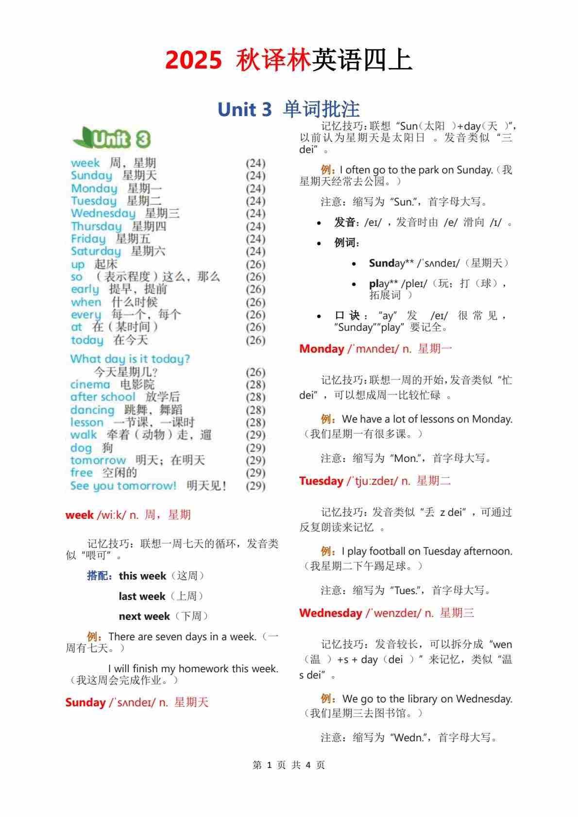 2025秋译林四上单词批注Unit 4