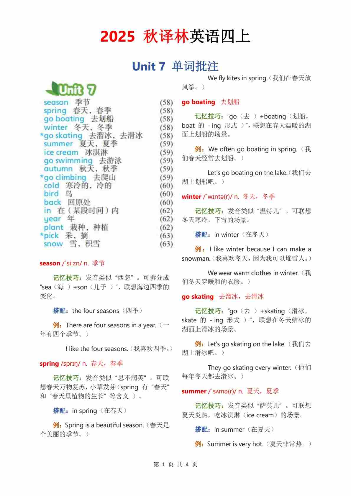 2025秋译林四上单词批注Unit 7
