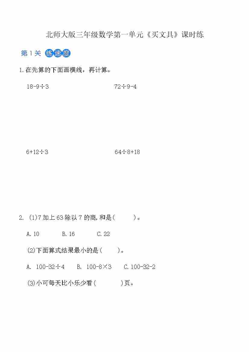 北师大版三年级上数学第1单元《买文具》课时练(含答案)