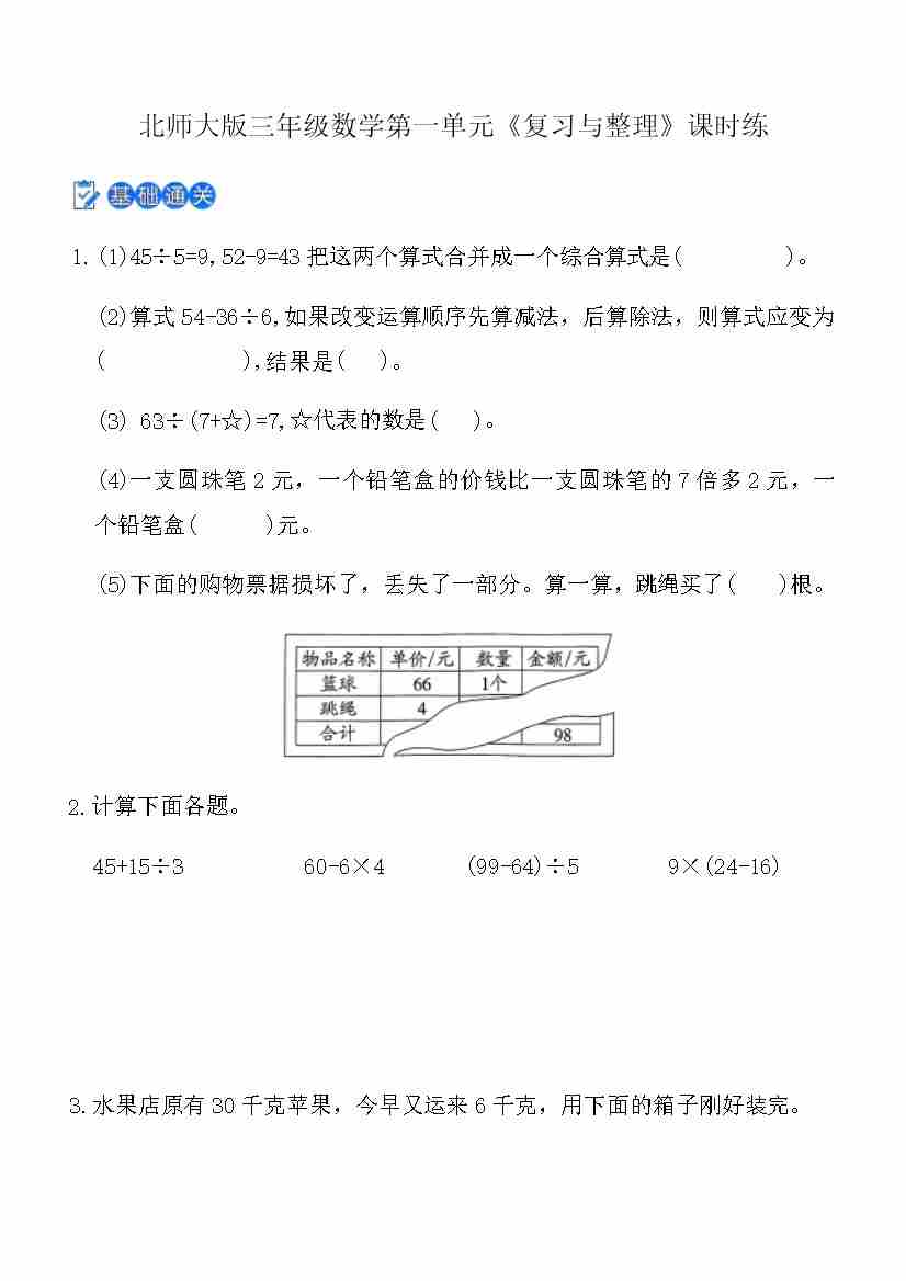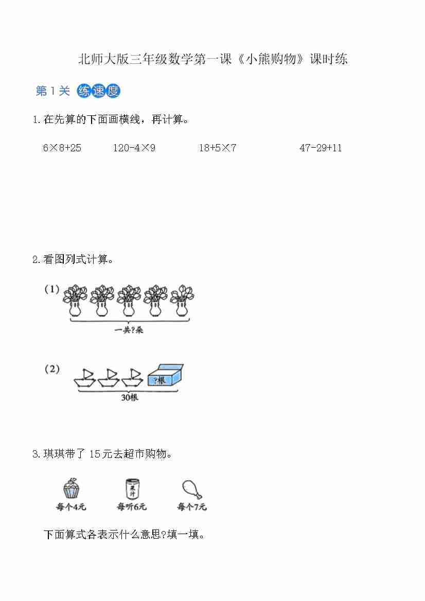 北师大版三年级上数学第1课《小熊购物》课时练(含答案)
