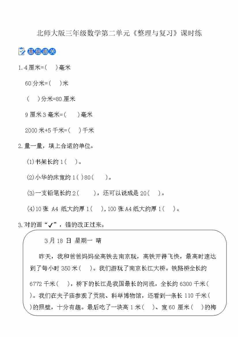 北师大版三年级上数学第2单元《整理与复习》课时练(含答案)