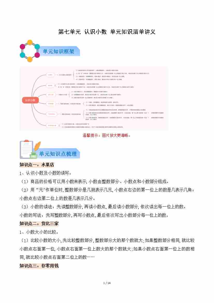 第七单元 认识小数(知识清单)数学北师大版三年级上册(原卷版)