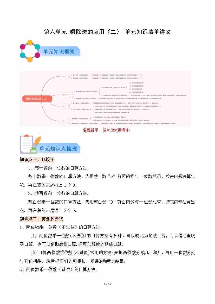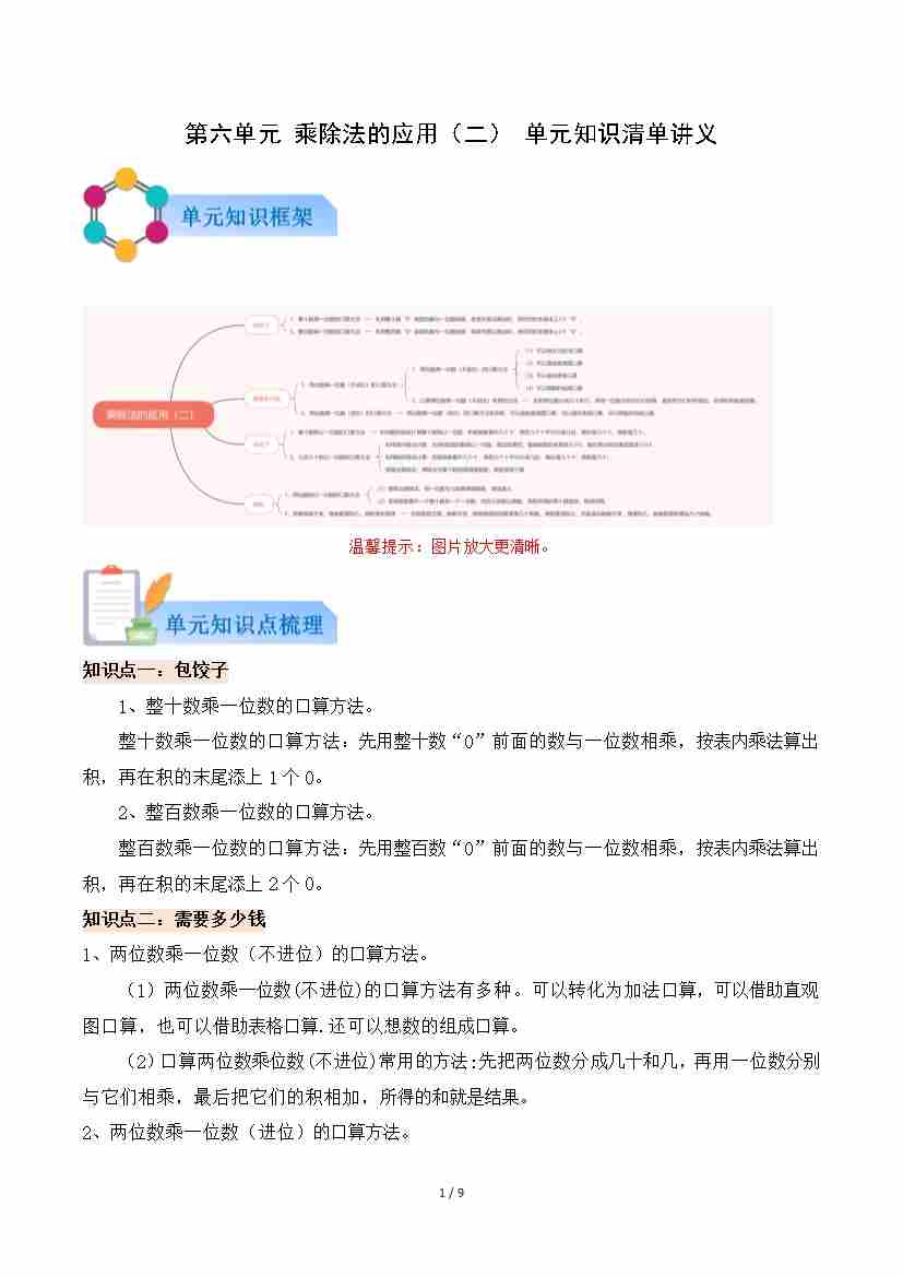 第六单元 乘除法的应用(二)(知识清单)数学北师大版三年级上册(原卷版)