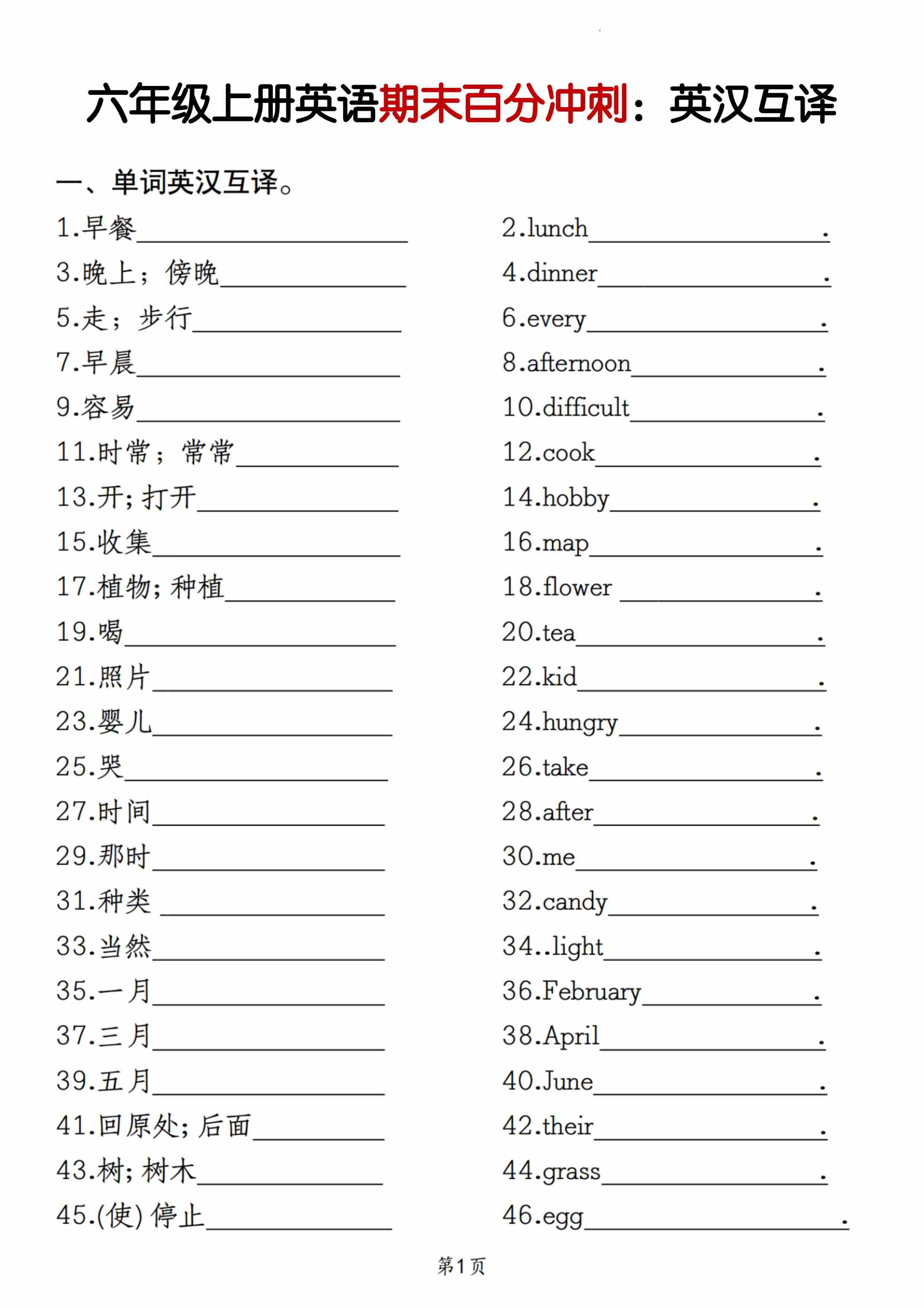 六上人教PEP版英语【期末百分冲刺:英汉互译】