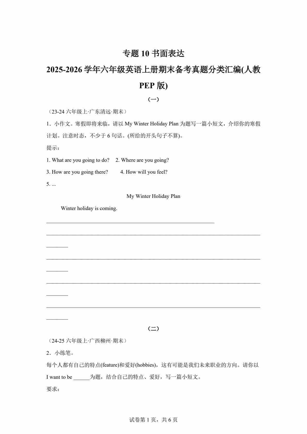 六上人教PEP版英语【期末真题汇编:专题10 书面表达】