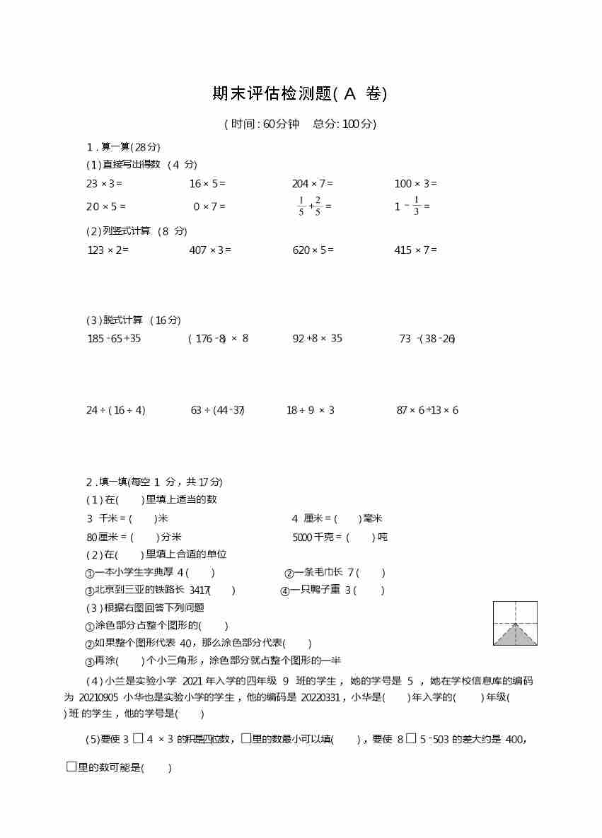 期末评估检测题(A卷)(无答案)2025-2026学年三年级上册数学人教版(2024)