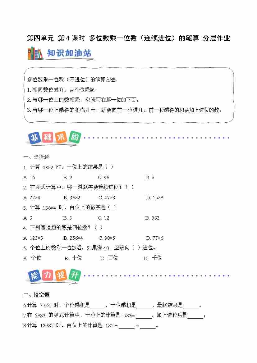 第四单元 第04课时 多位数乘一位数(连续进位)的笔算(分层作业)