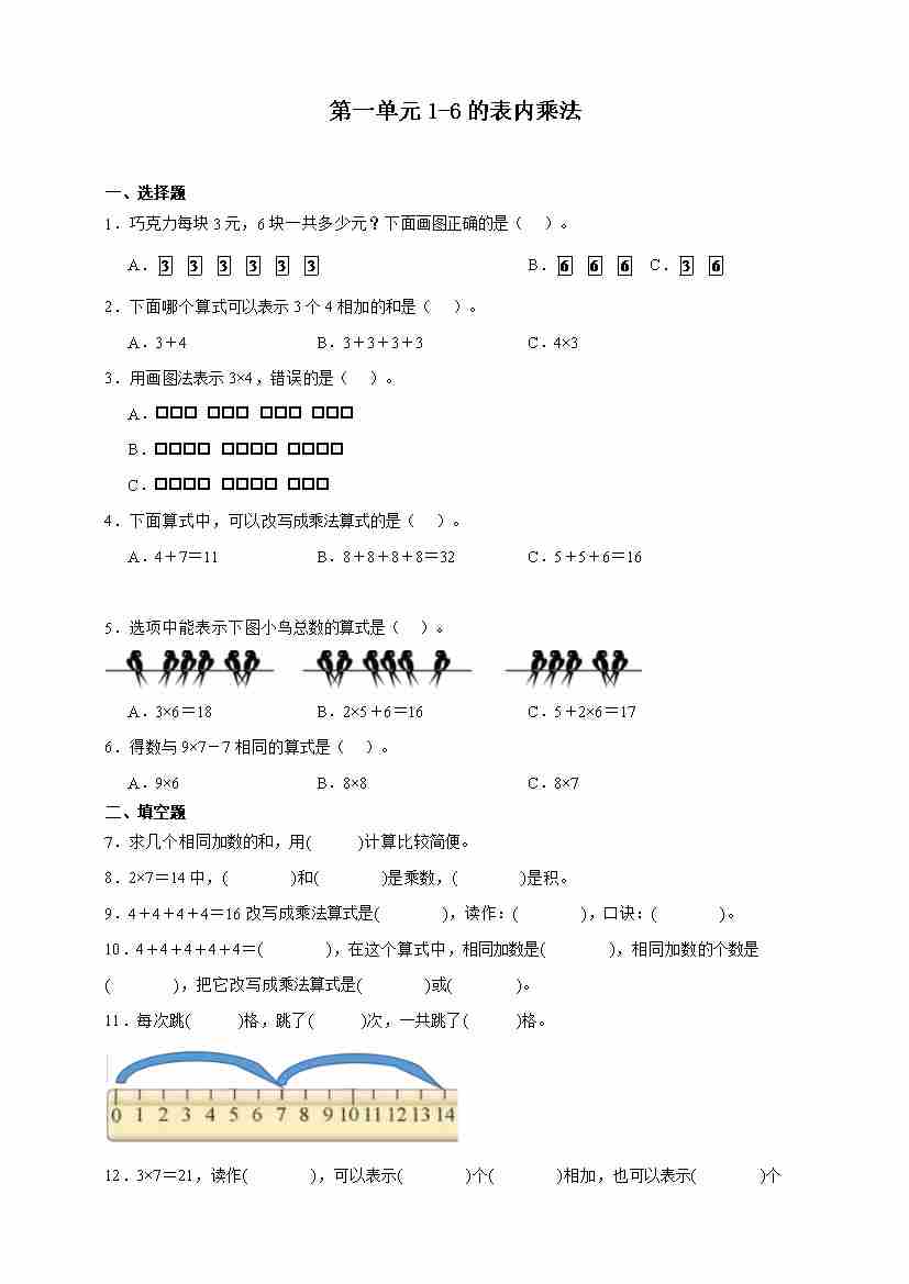 2025-2026学年小学数学二年级上册苏教版(2024)第一单元1-6的表内乘法(基础卷)(含解析)
