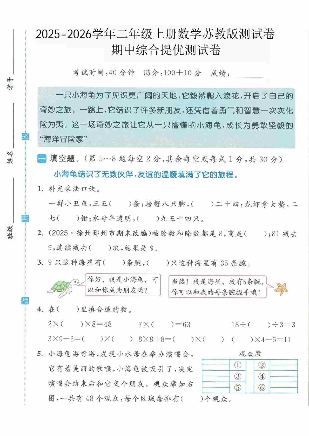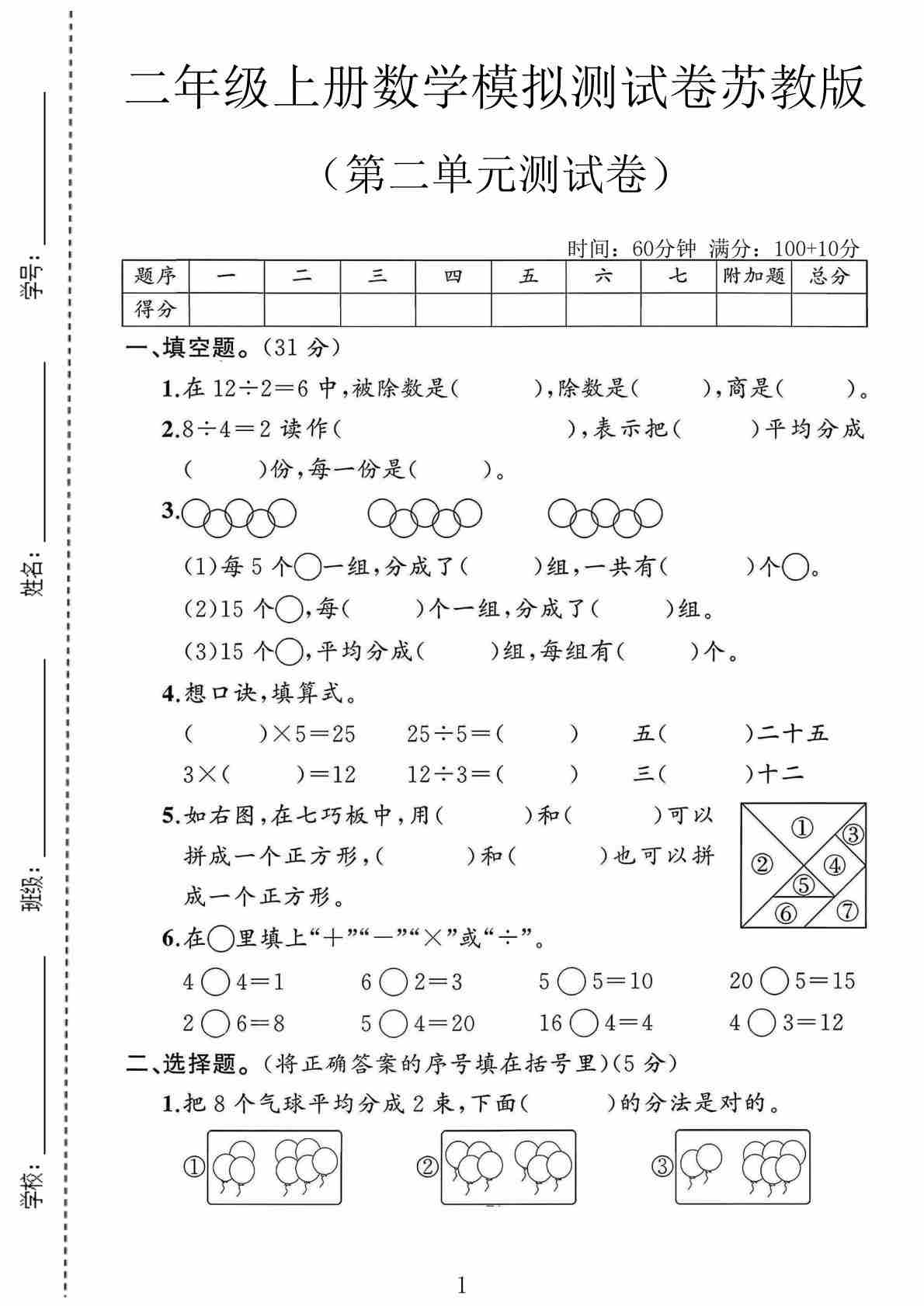 二(上)2025秋苏教版数学【第一单元测试卷】