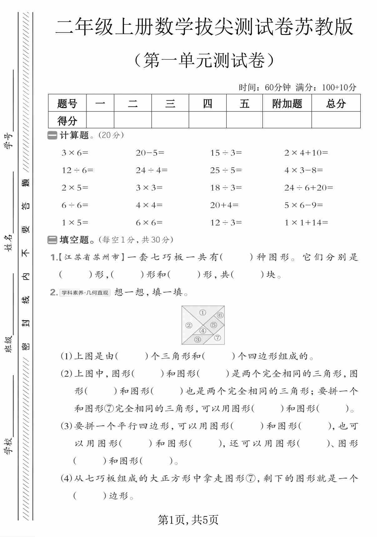 二(上)苏教版数学第一单元拔尖测试卷3(含答案5页)