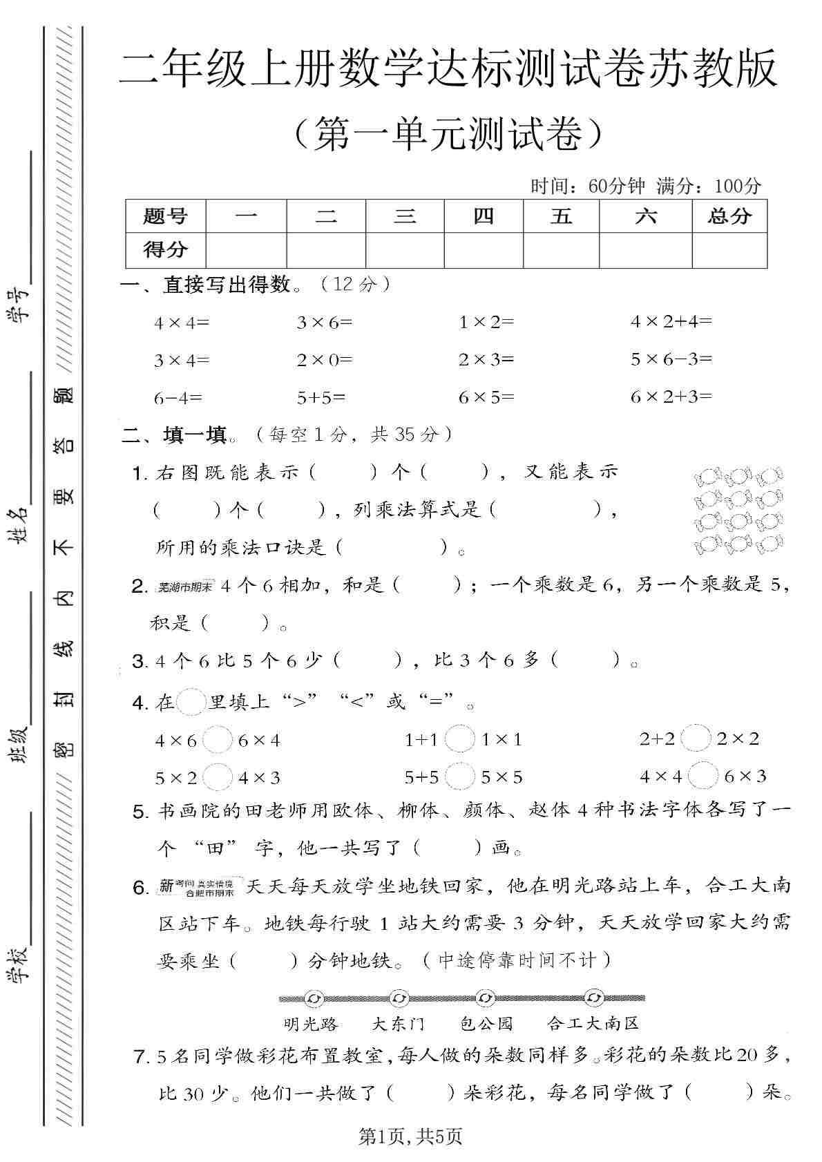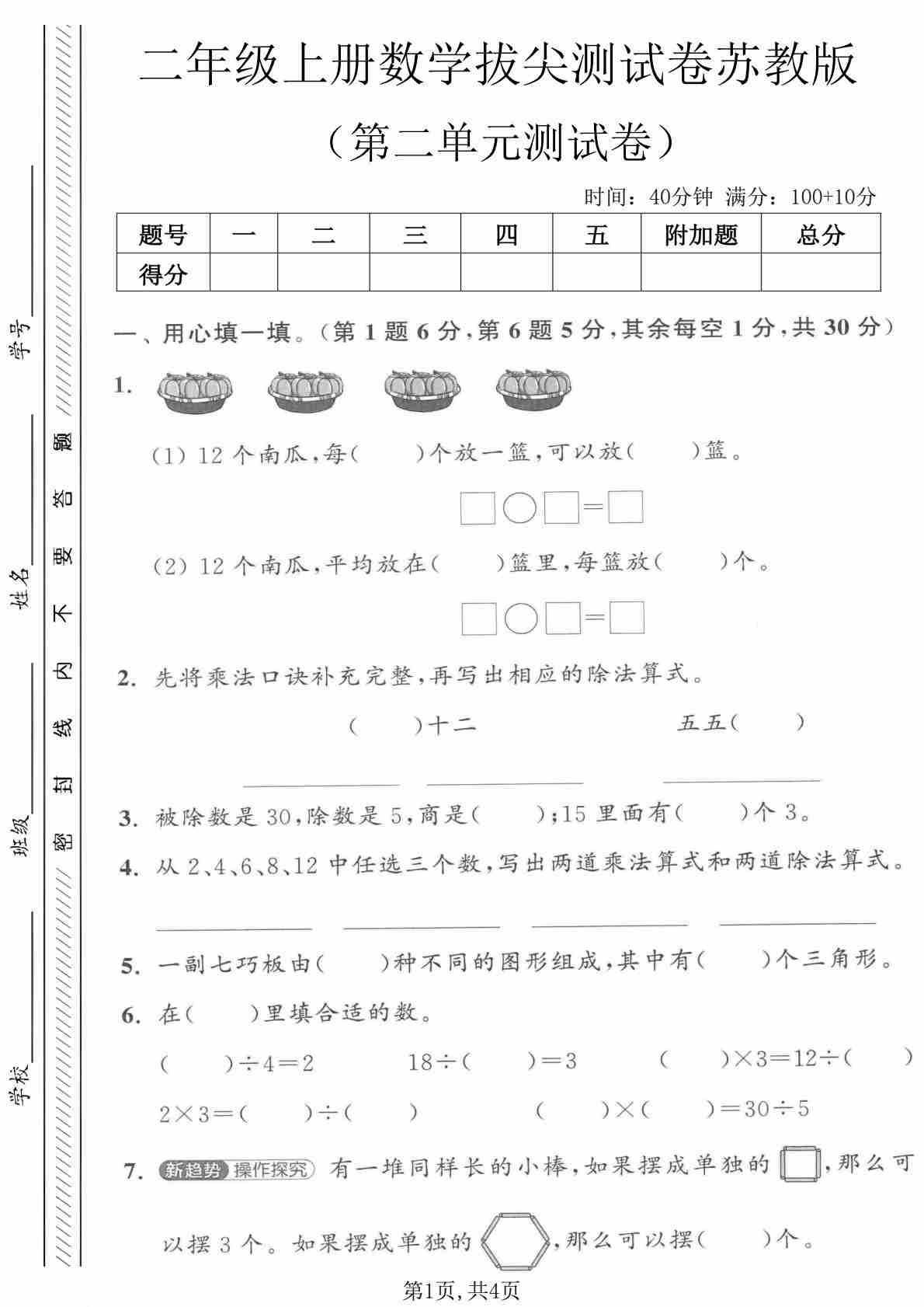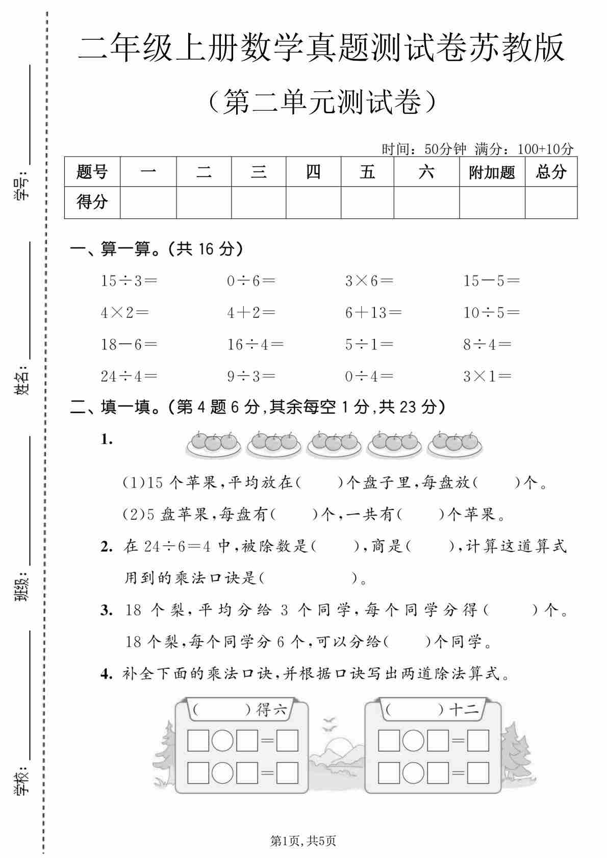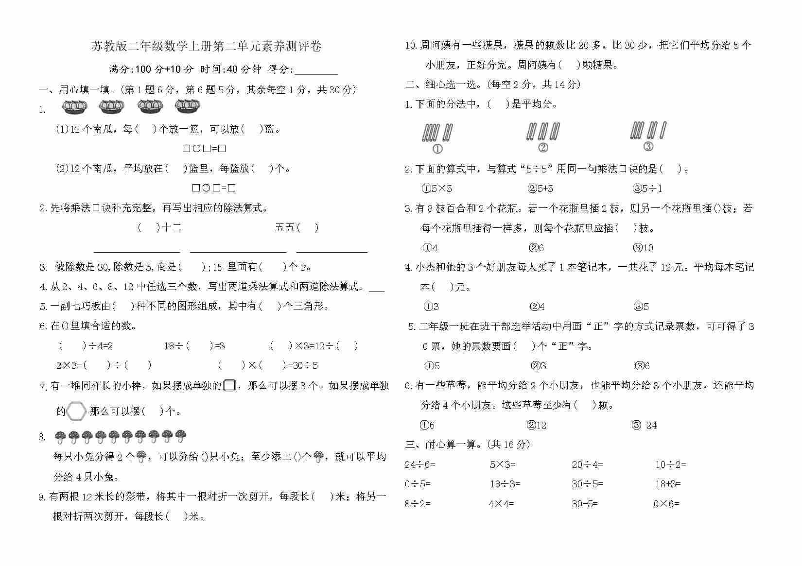 苏教版二年级数学上册第二单元1~6的表内除法素养测评卷(含答案)