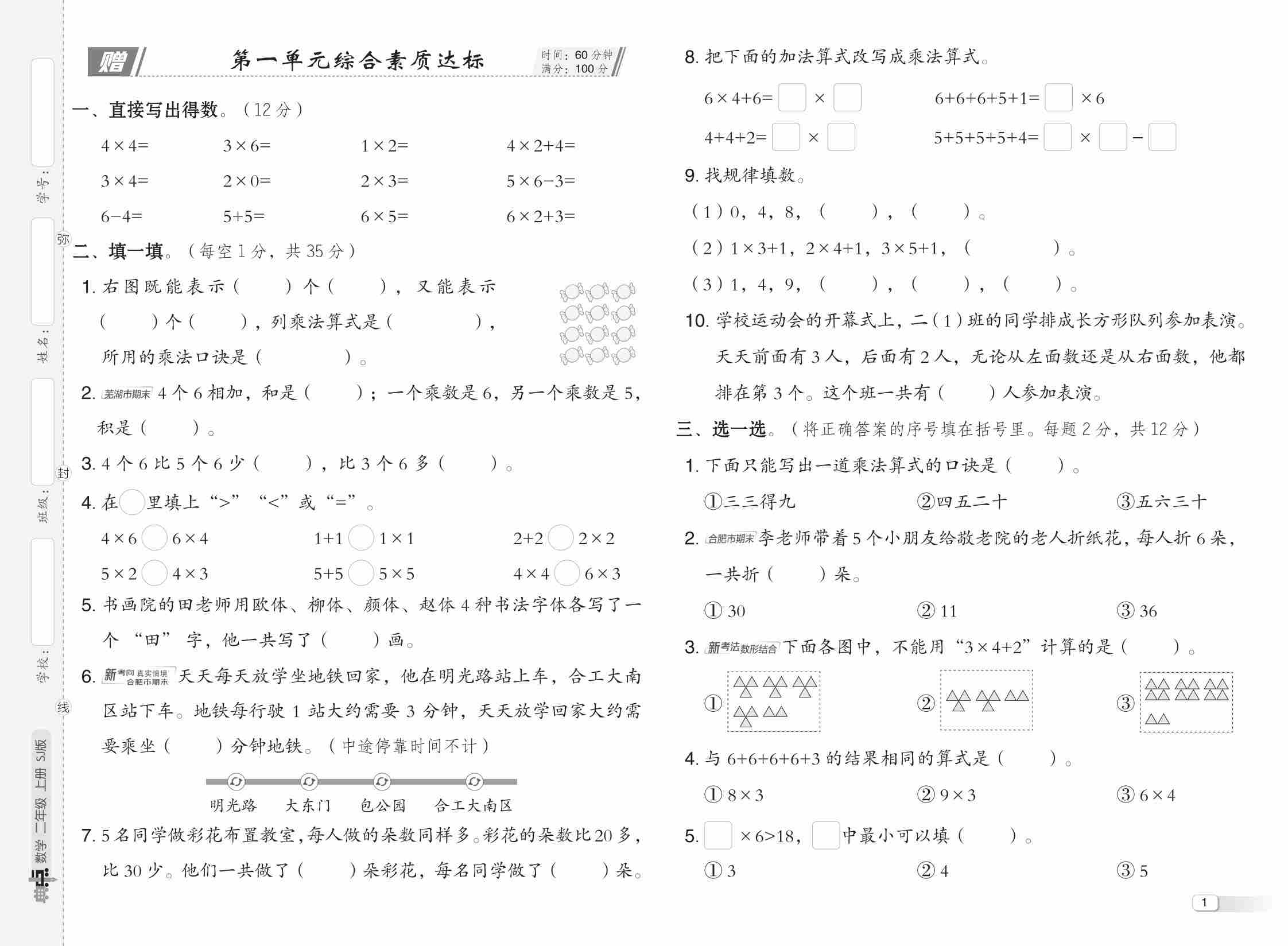 二(上)苏教版25秋数学第一单元达标测试卷2