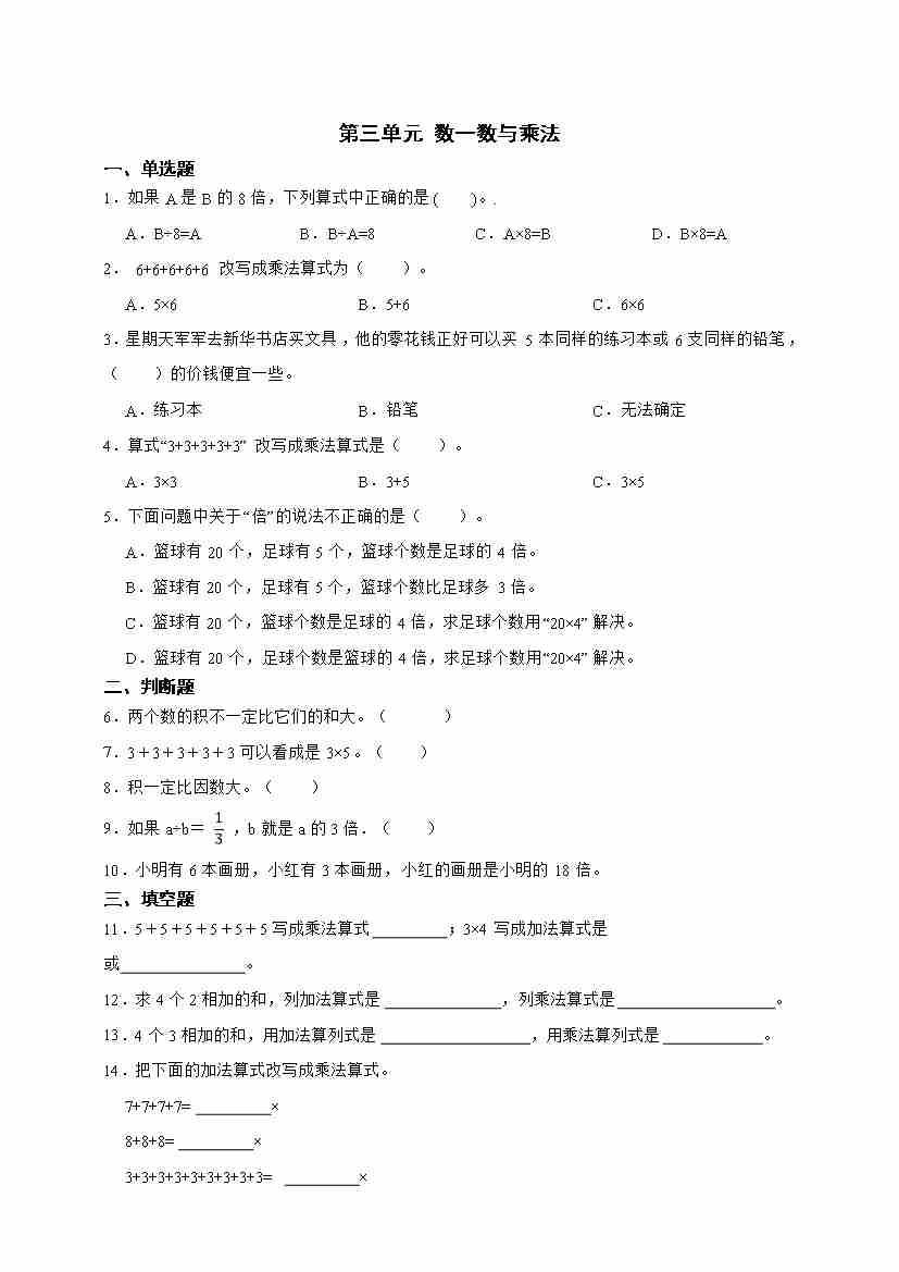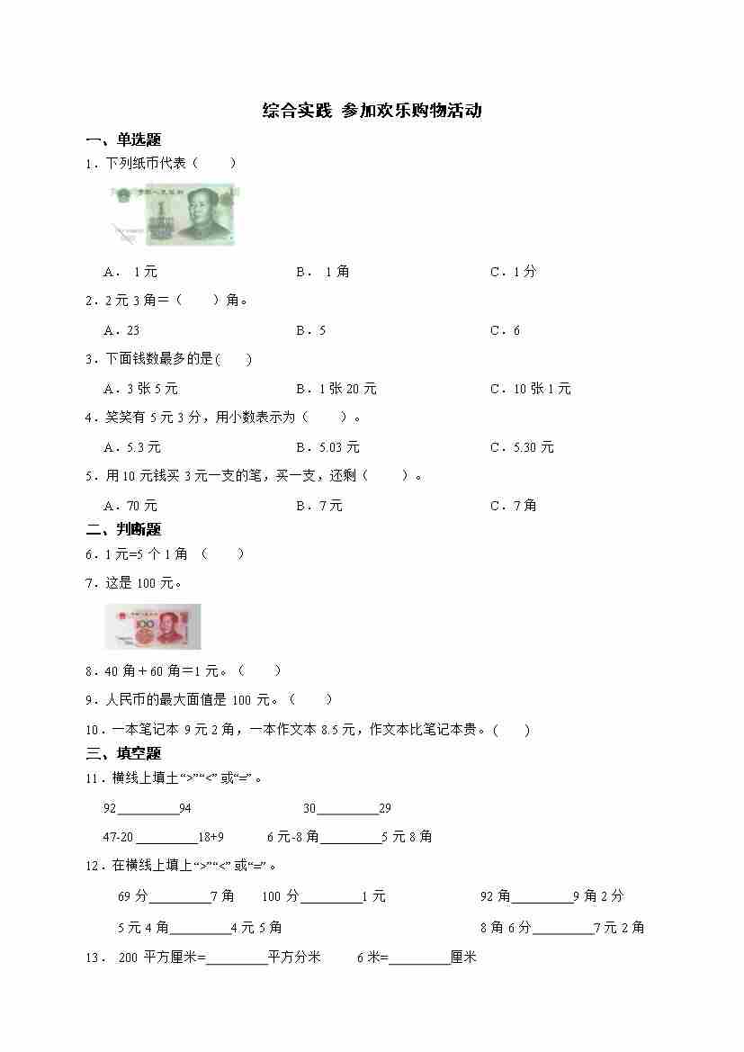 北师大版二年级上册综合实践《参加欢乐购物活动》单元检测卷(含答案)
