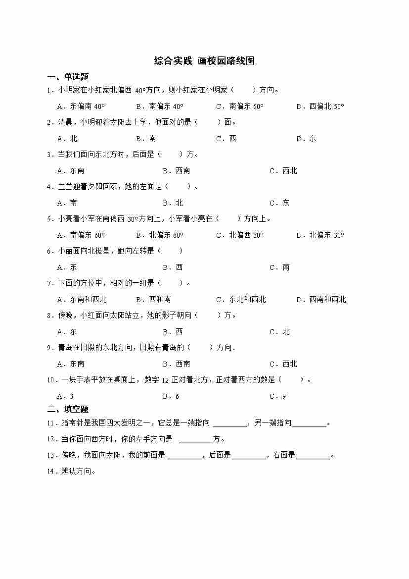 北师大版二年级上册综合实践《画校园路线图》单元检测卷(含答案)