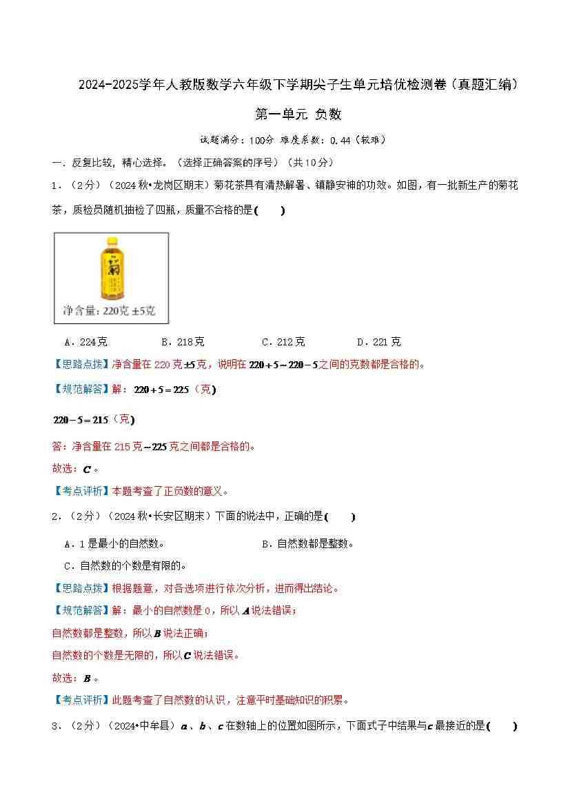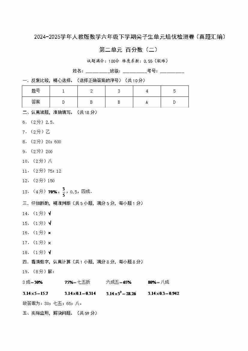 第二单元 百分数(二)-(真题汇编)A3原卷