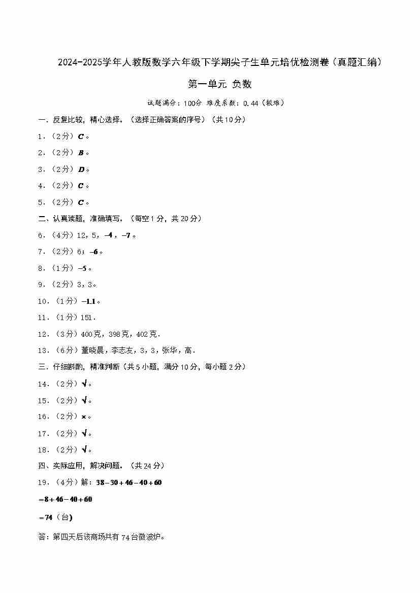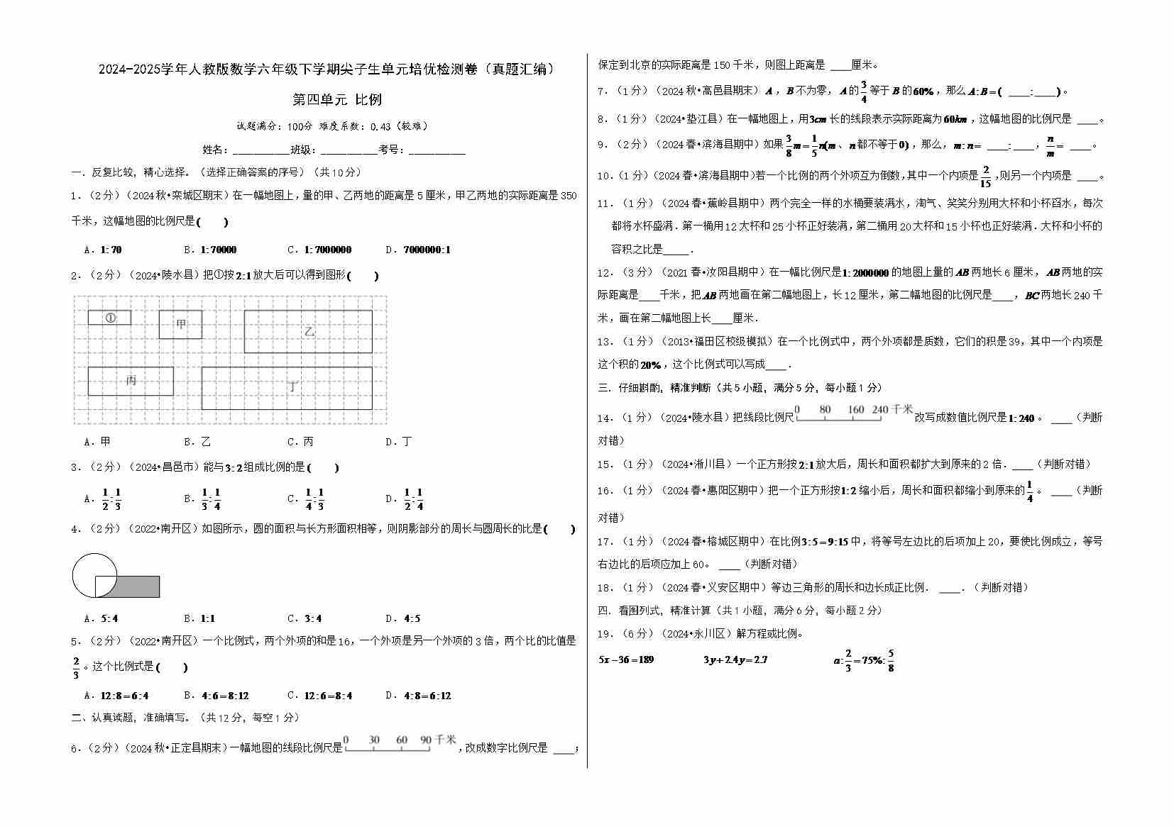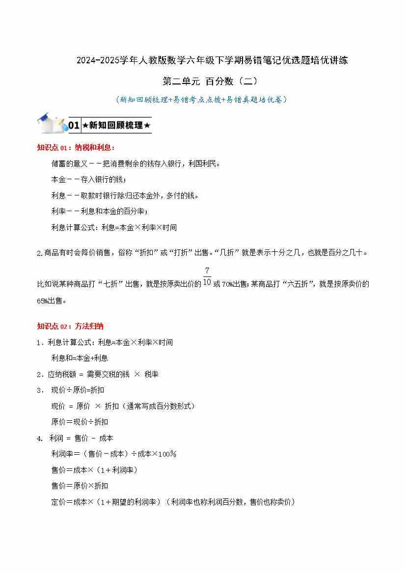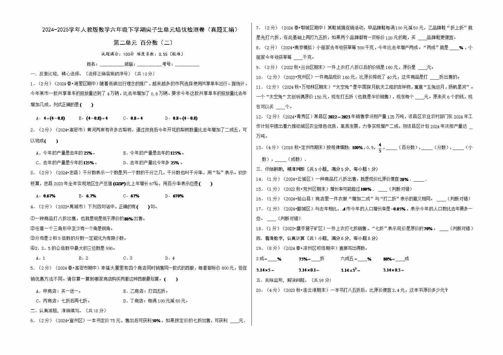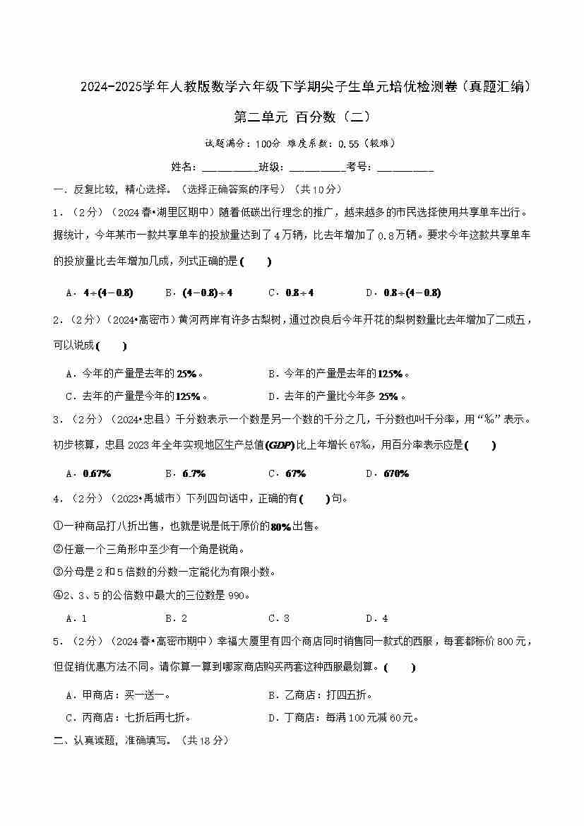 第二单元 百分数(二)-(真题汇编)A4原卷