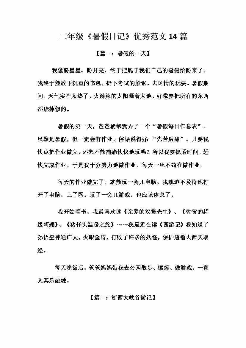 【(暑假日记)优秀范文14篇】二年级语文