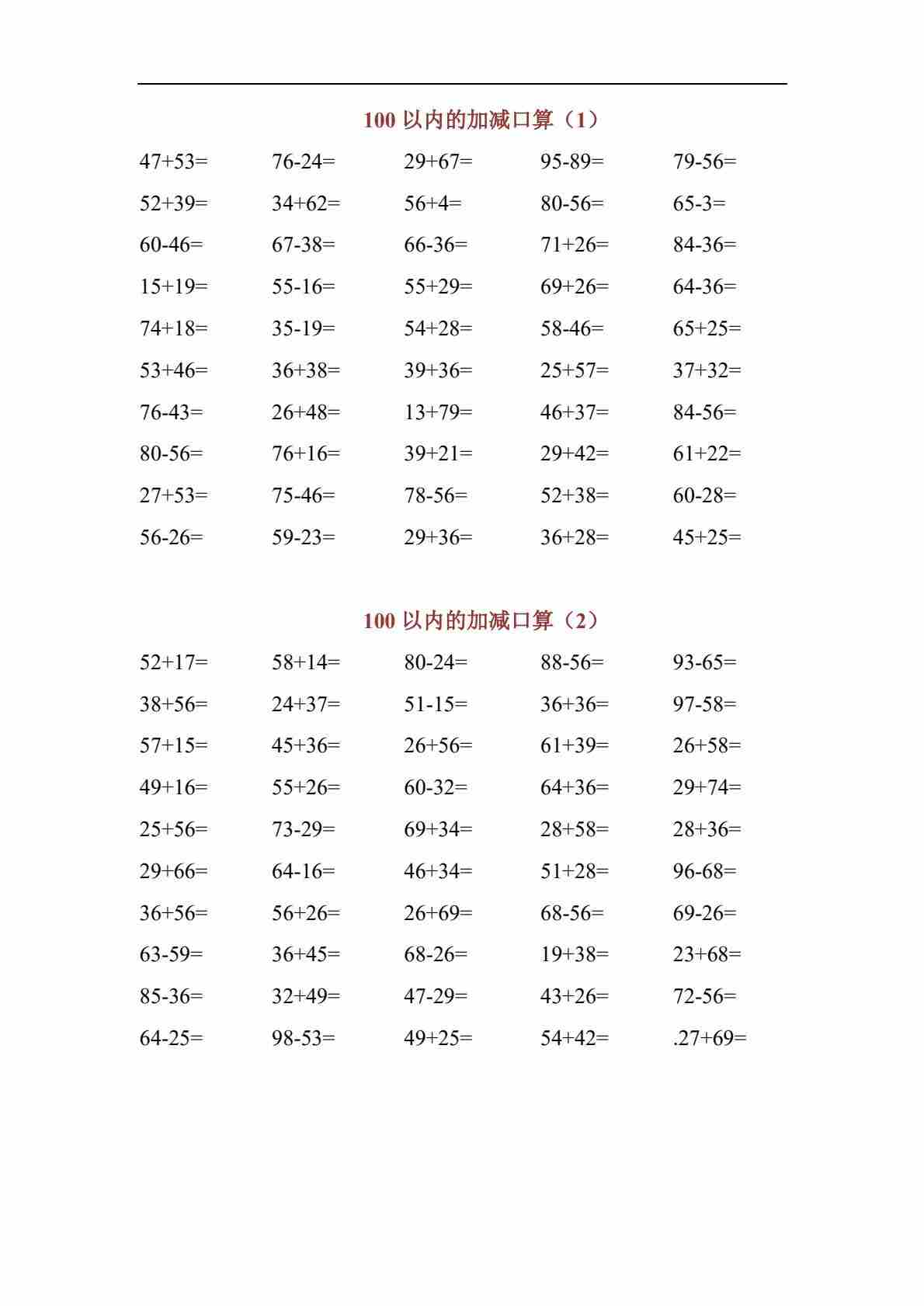 二(上)数学100以内口算1000题