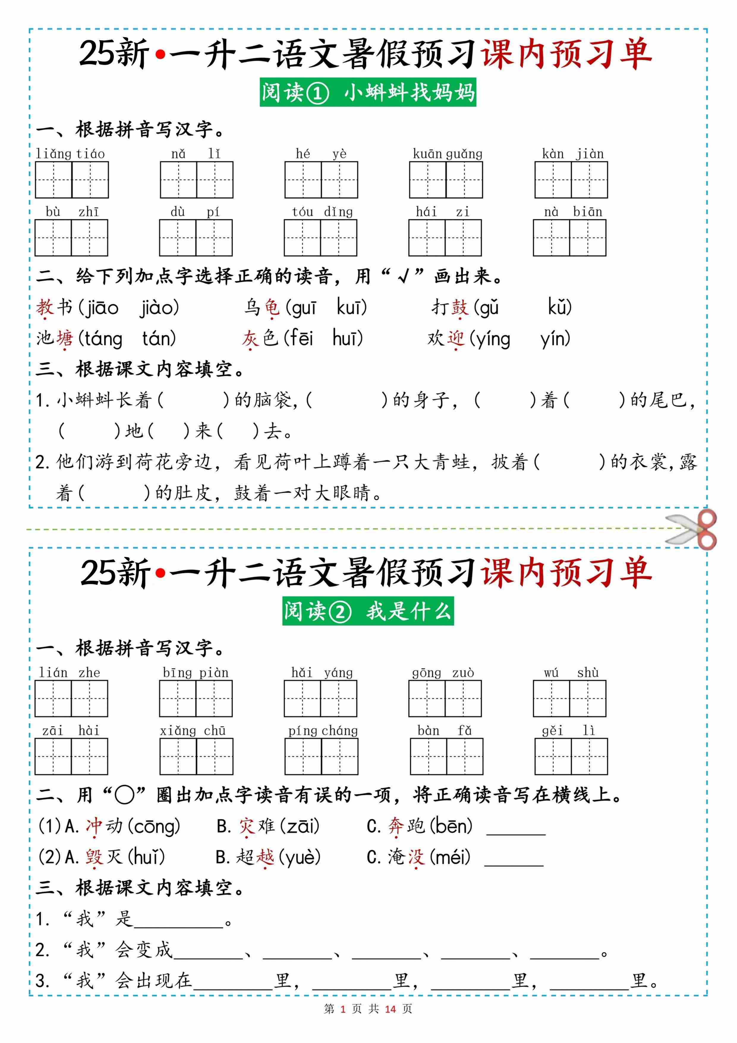 二(上)语文【25新版-暑假预习课内预习单(14页)】