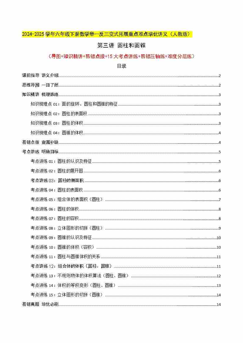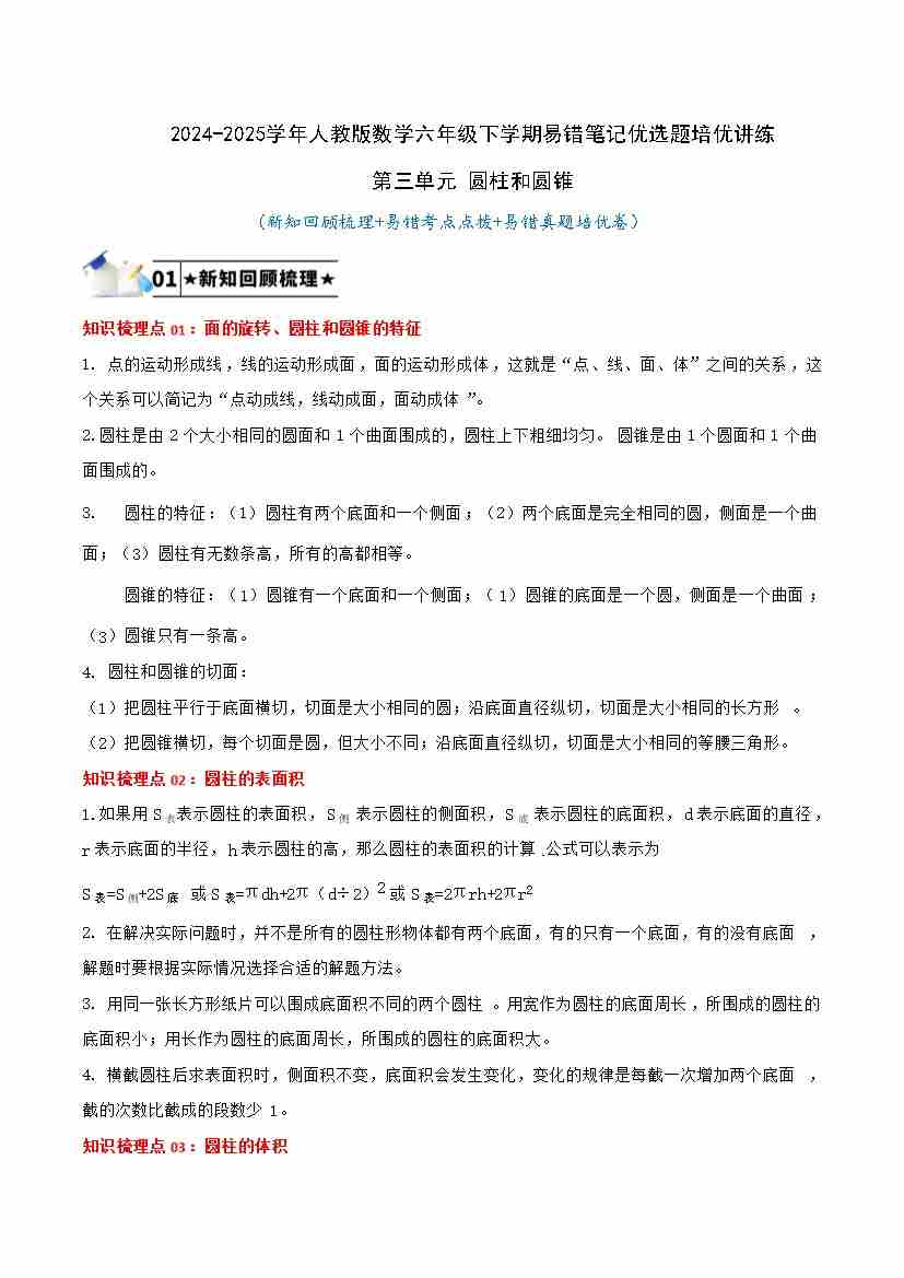 第三讲 圆柱和圆锥(单元讲义)-(人教版)学生版
