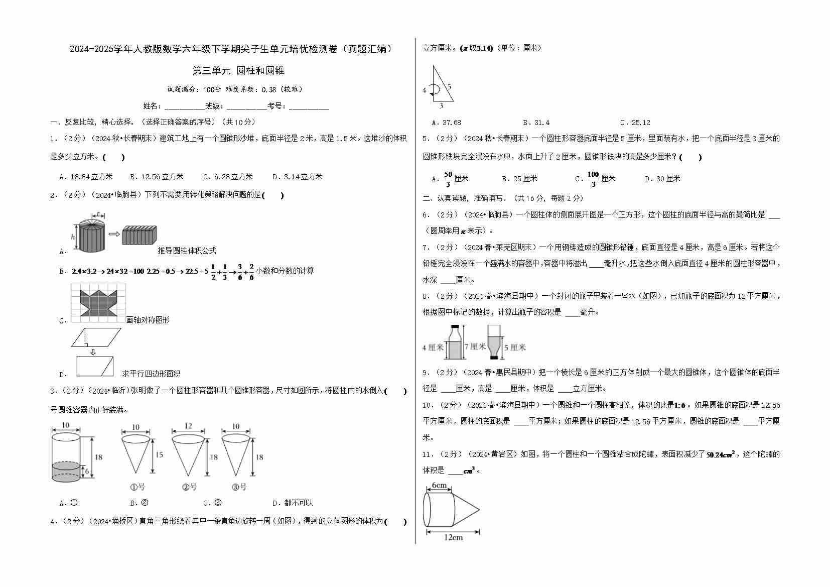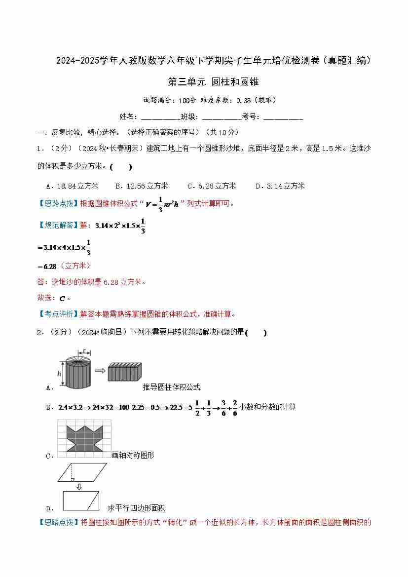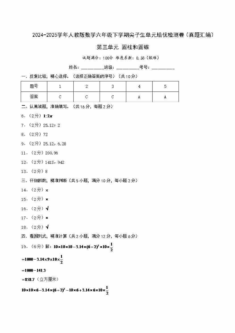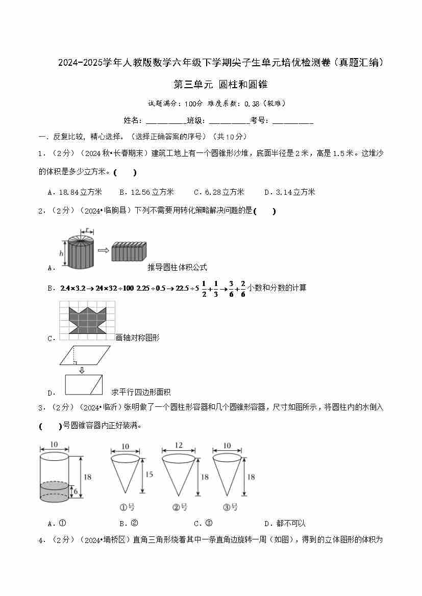 第三单元 圆柱和圆锥-(真题汇编)A3原卷