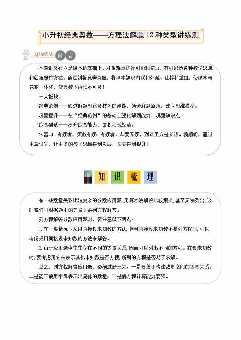 经典奥数-方程法解分数、百分数应用题12种类型精讲精练-小升初奥数应用题讲义