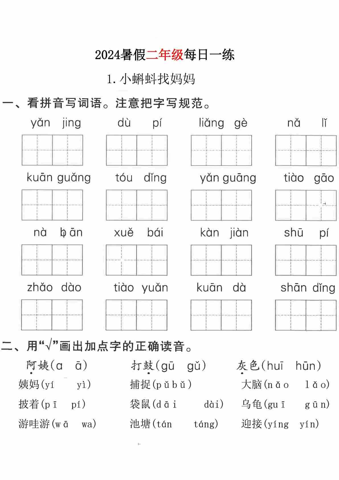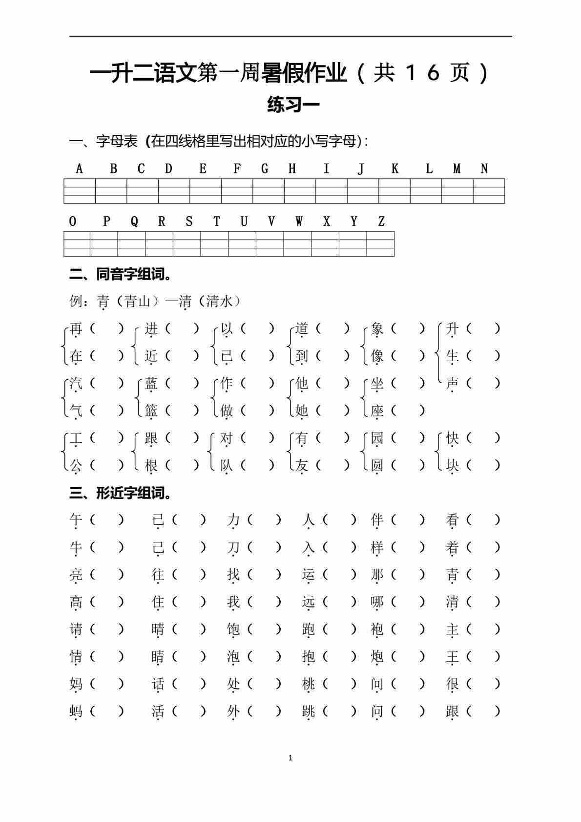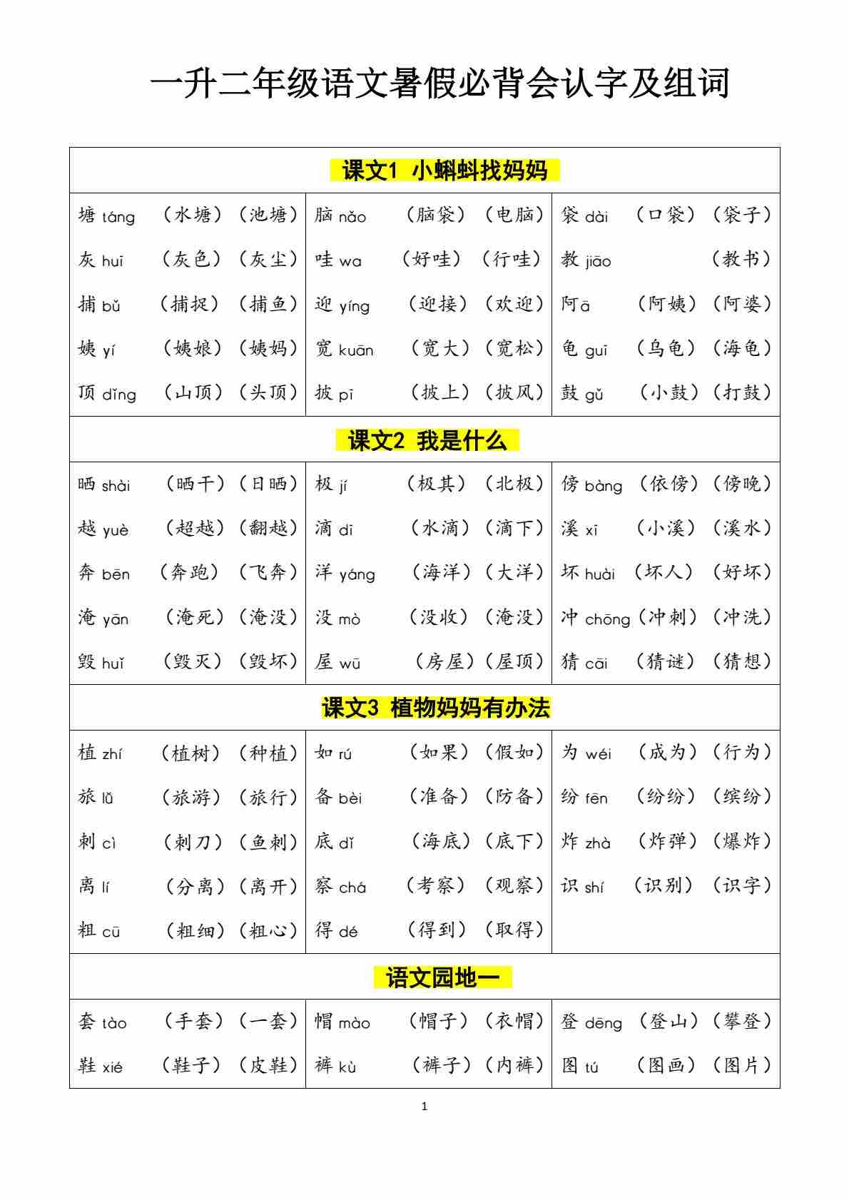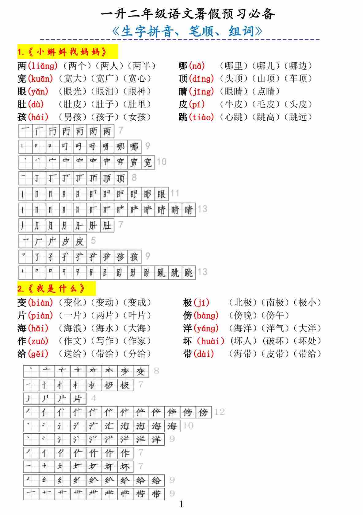 一升二年级语文暑假预习必备《生字拼音、笔顺、组词》