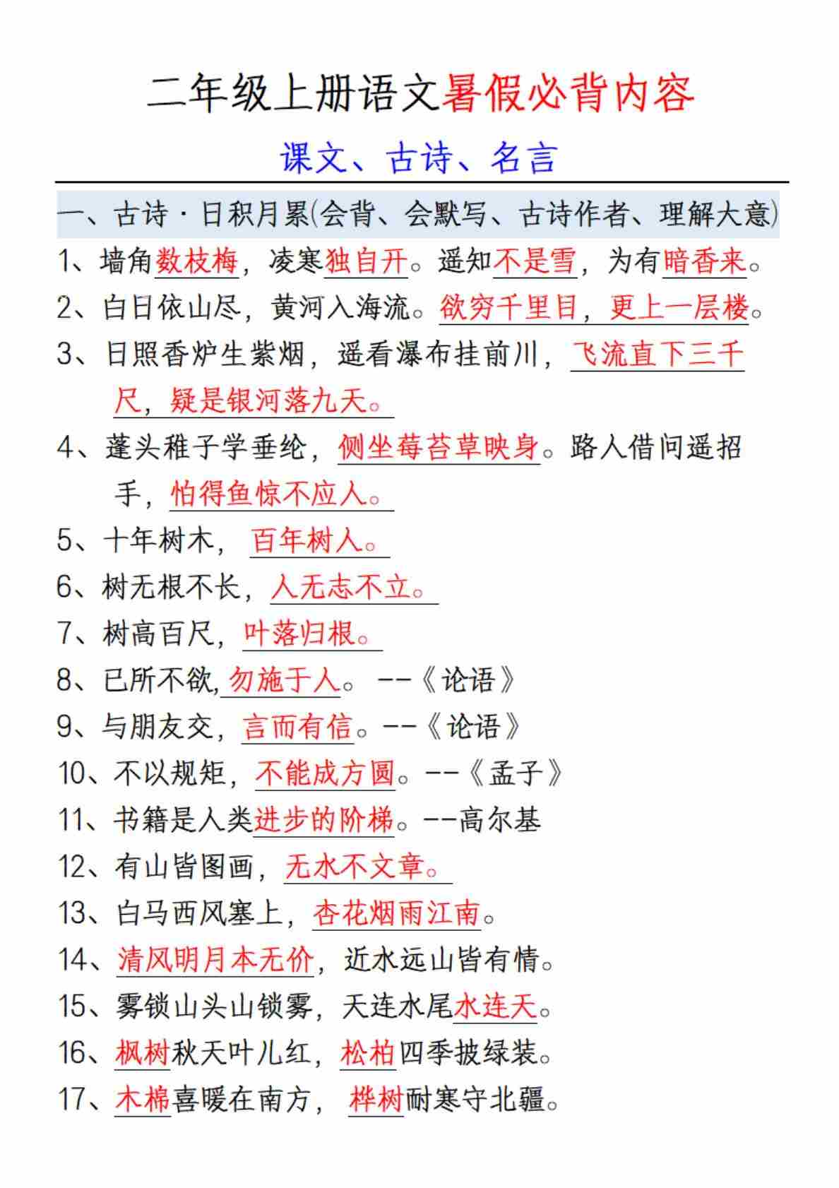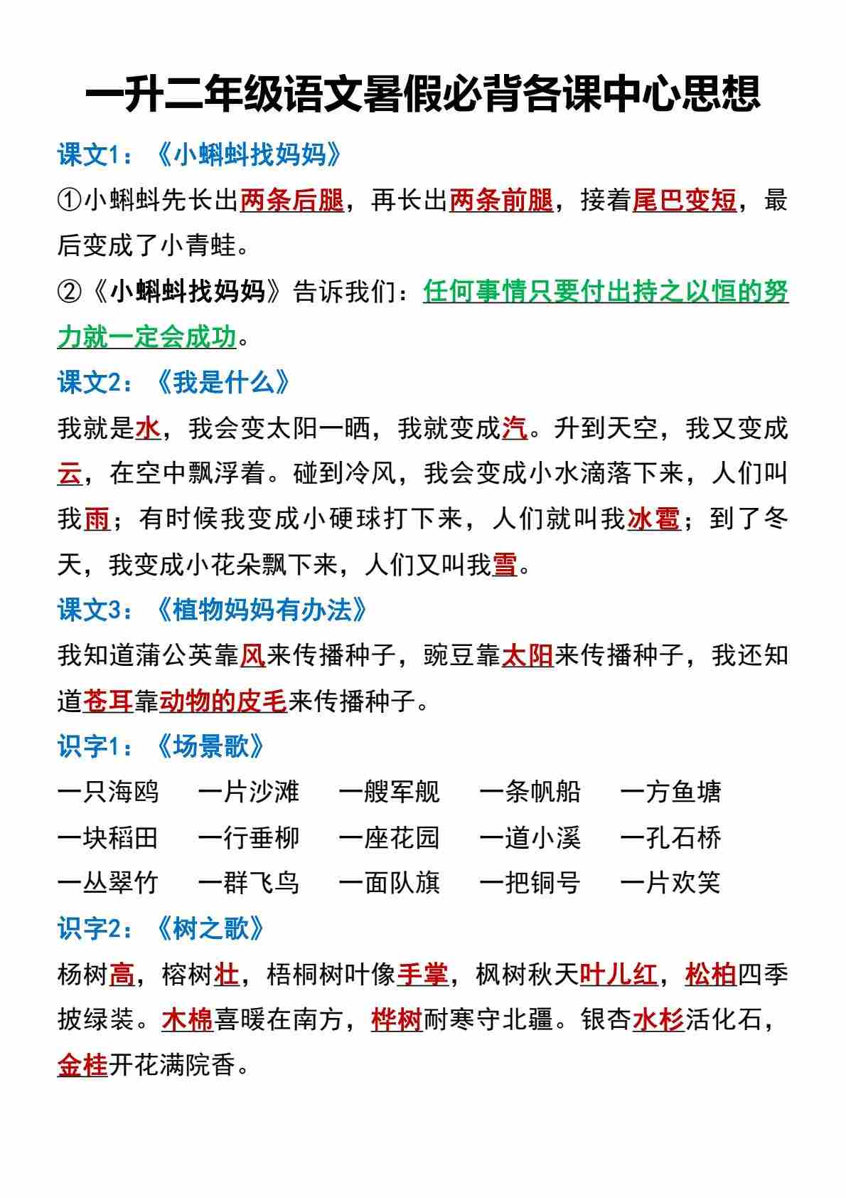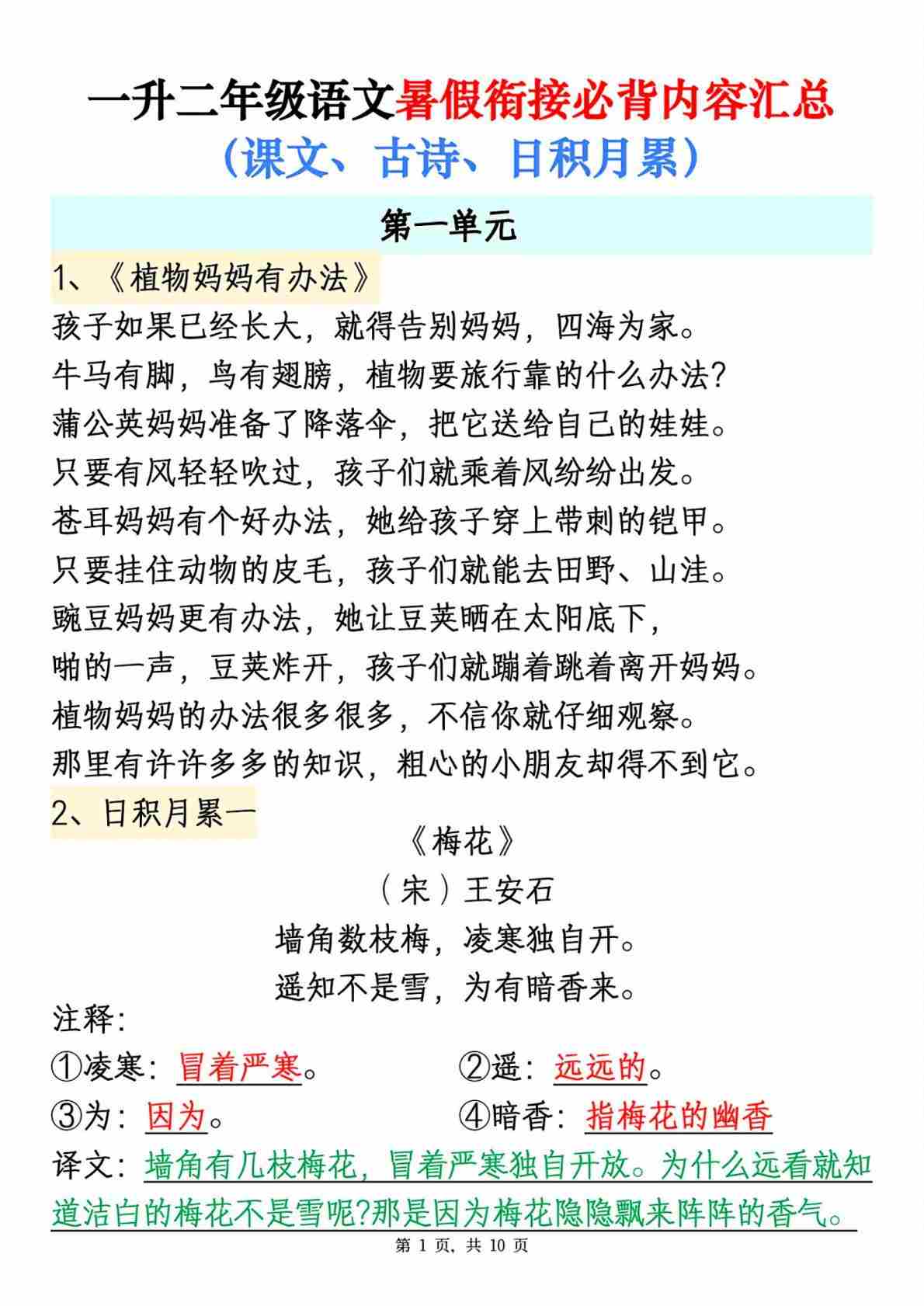 一升二年级语文暑假衔接必背内容汇总(课文、古诗、日积月累)10页