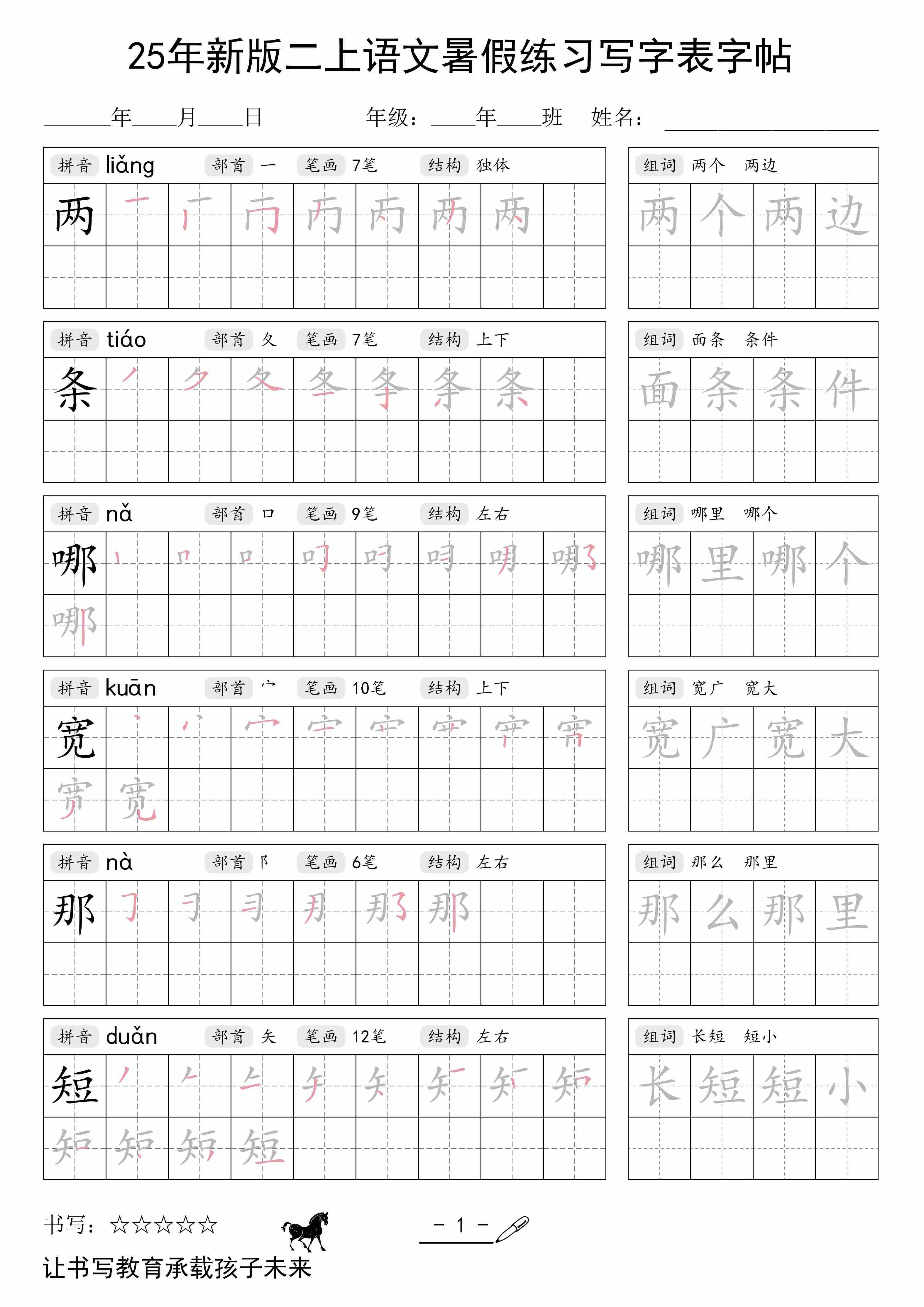 一升二语文【25年新版暑假练习(写字表)字帖】