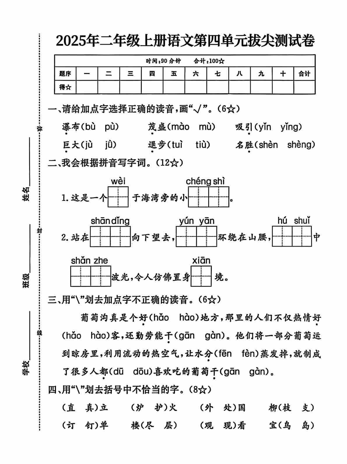 二(上)语文【2025年-第四单元测试卷2】