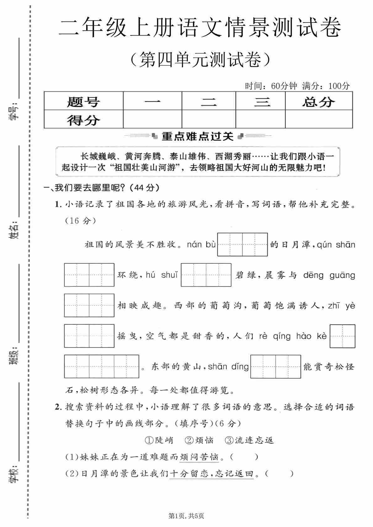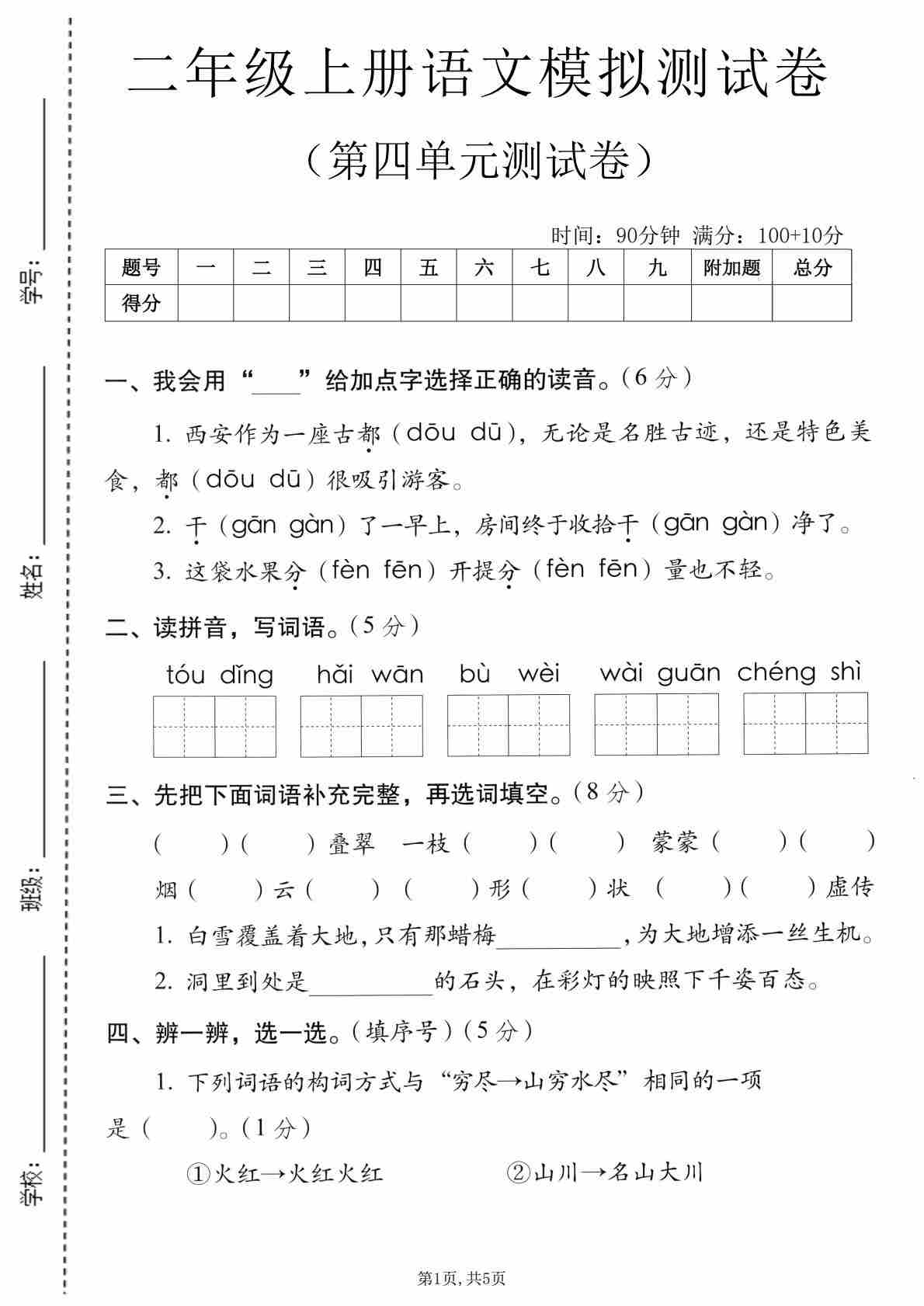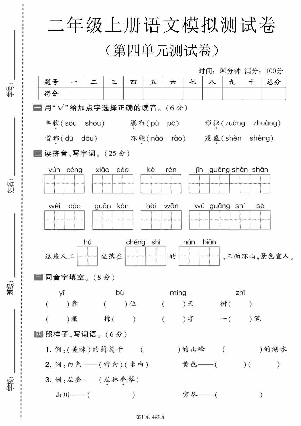 二(上)语文【第四单元模拟测试卷5】