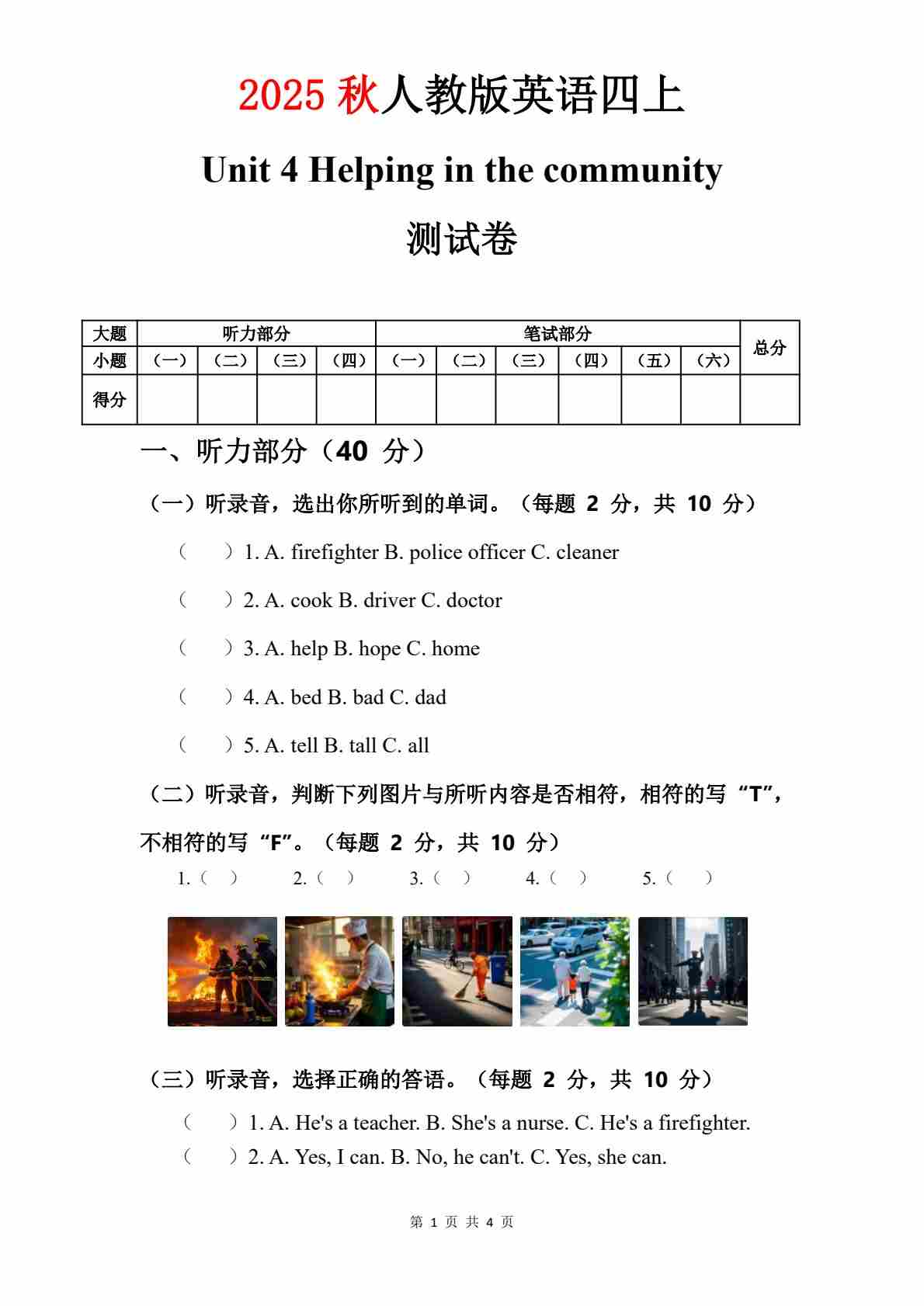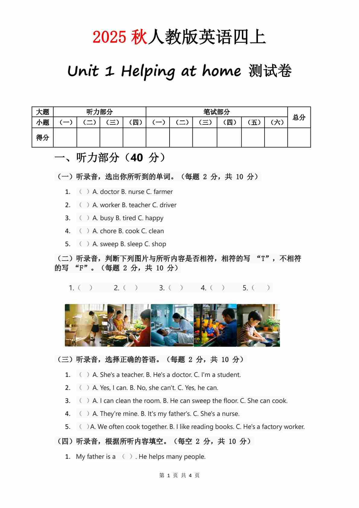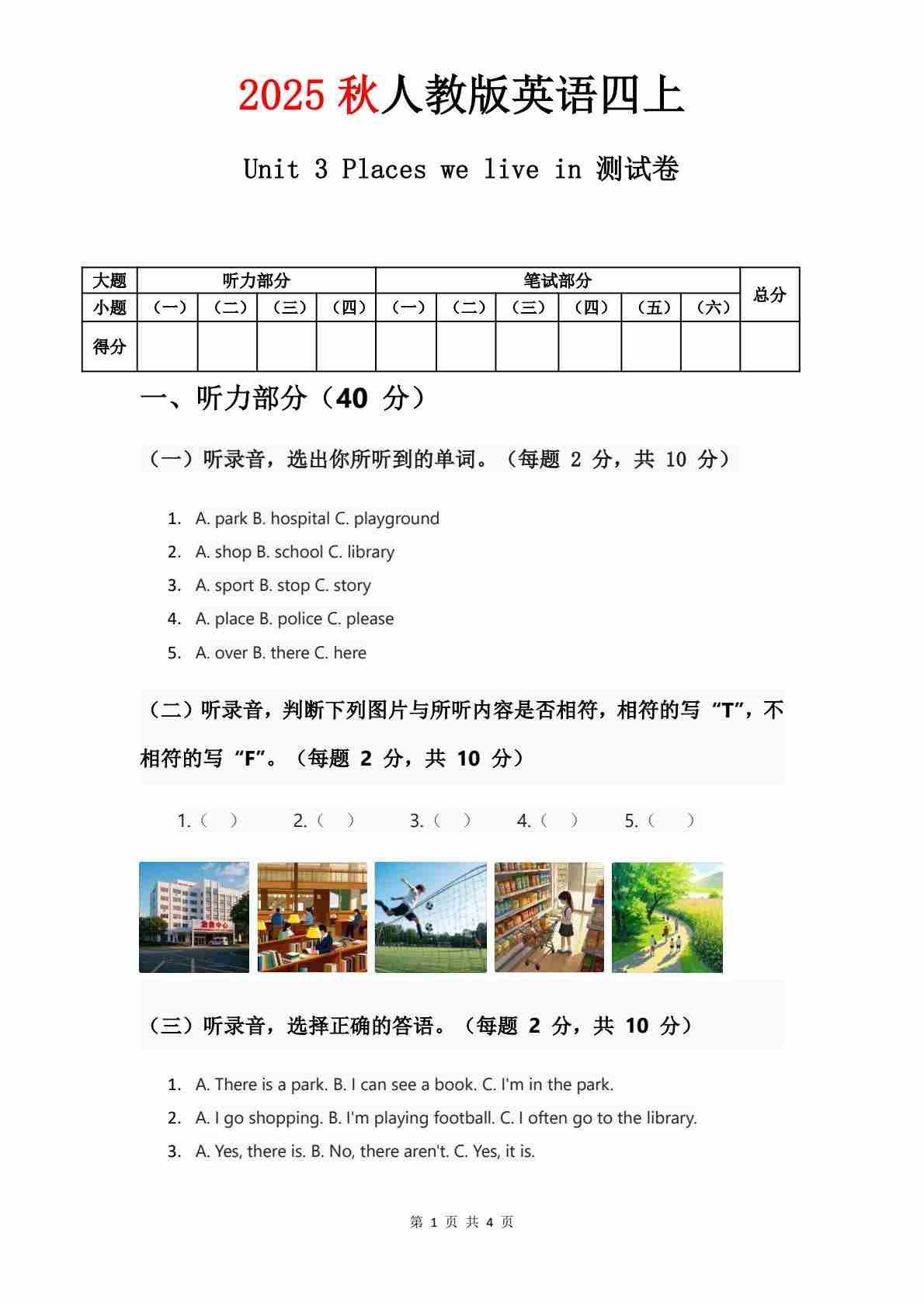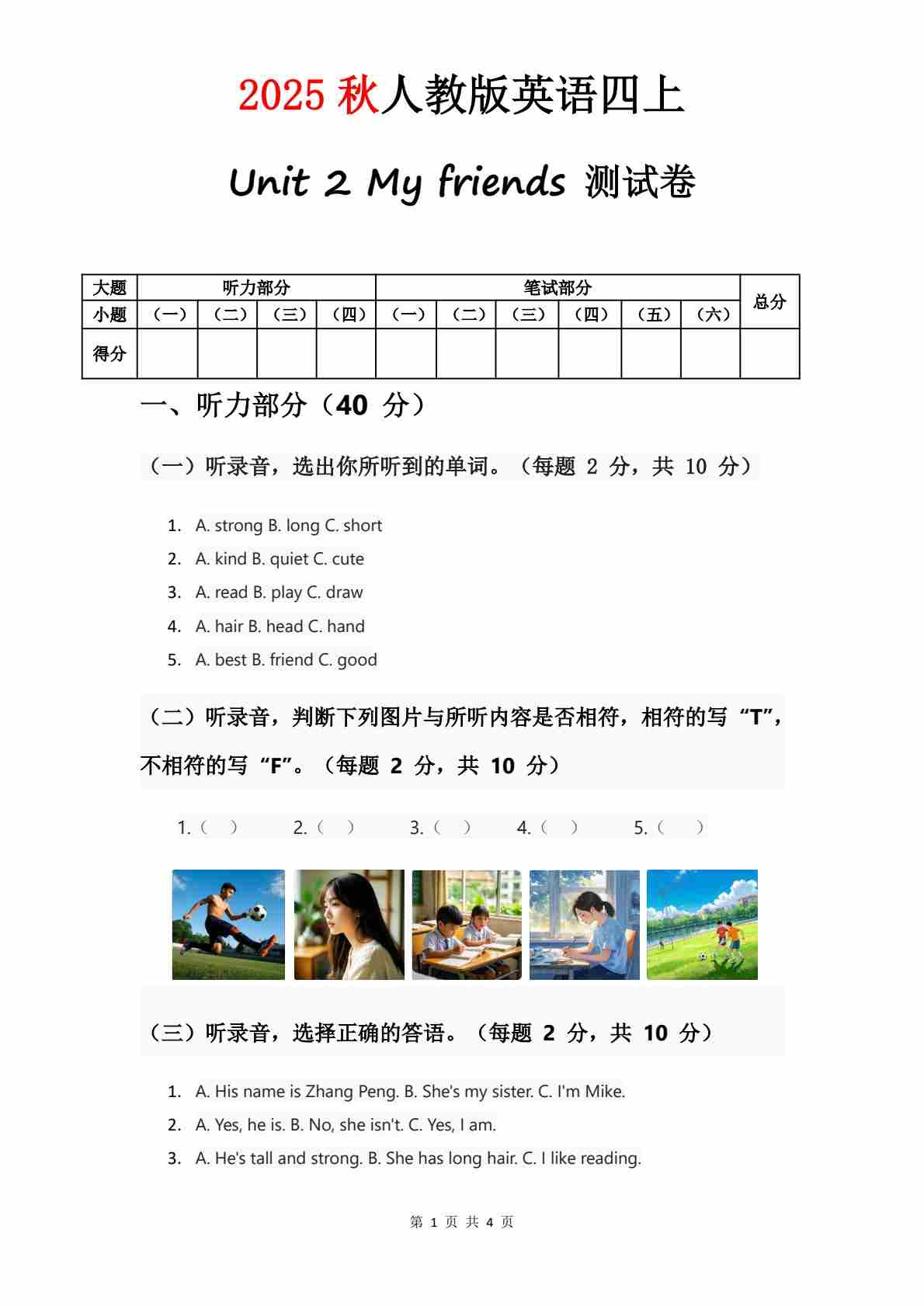 人教版四年级上册英语试卷 Unit 1