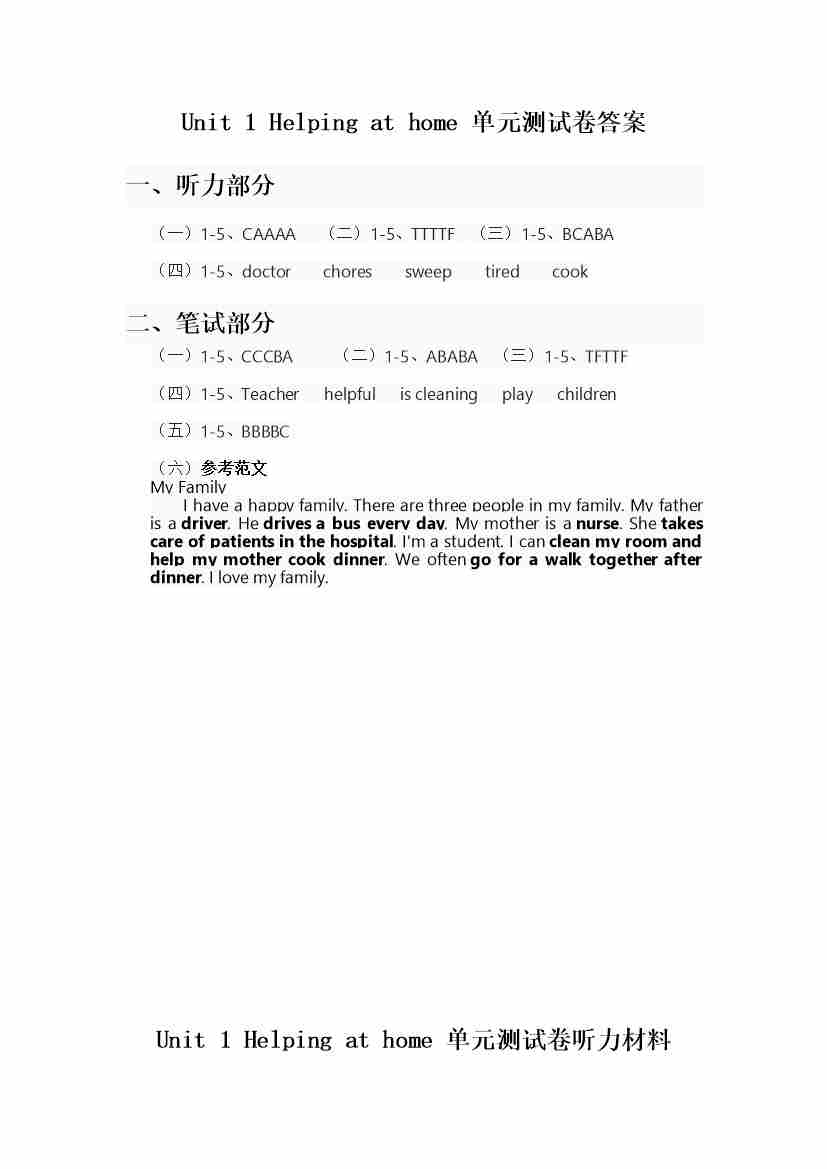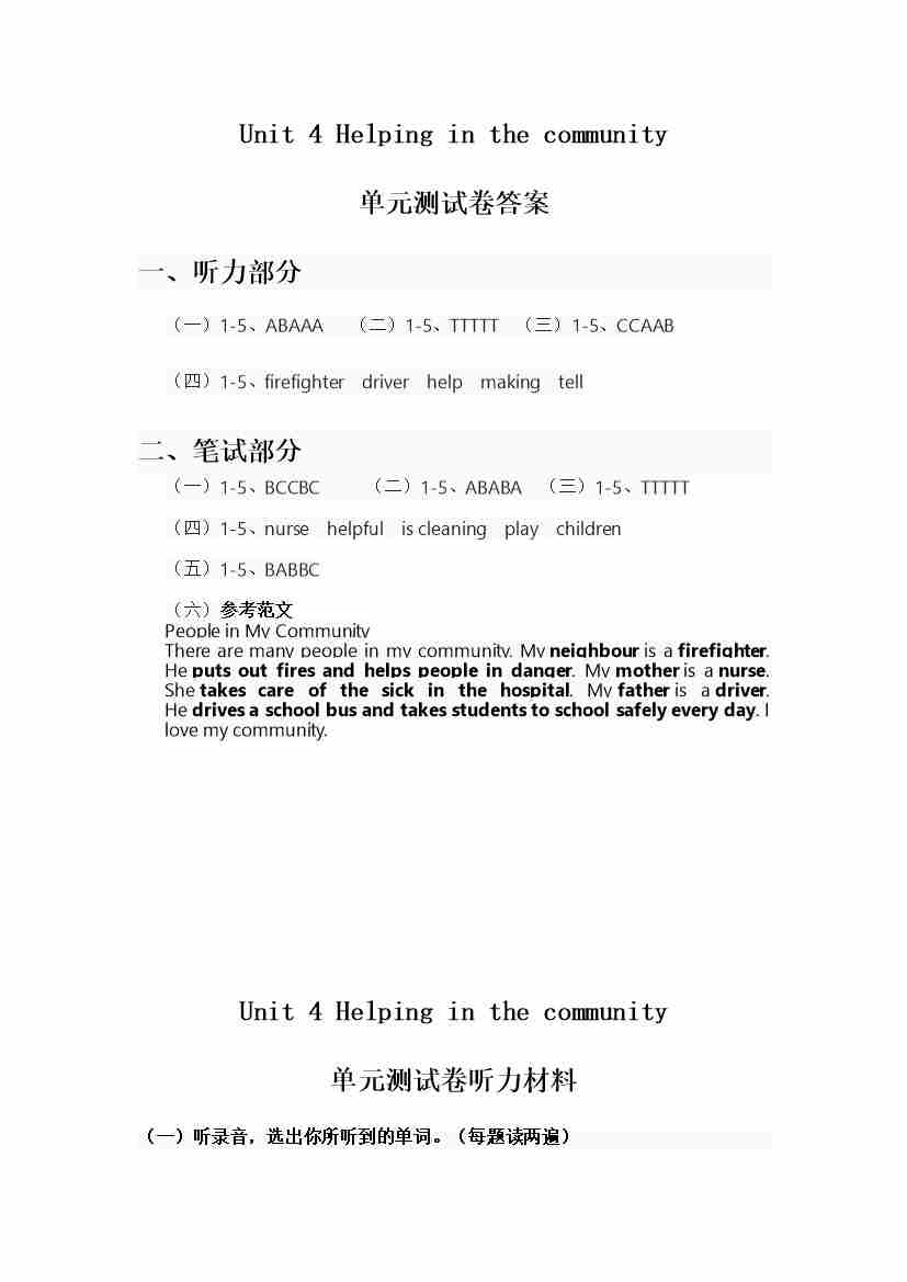人教版四年级上册英语试卷 Unit 1答案