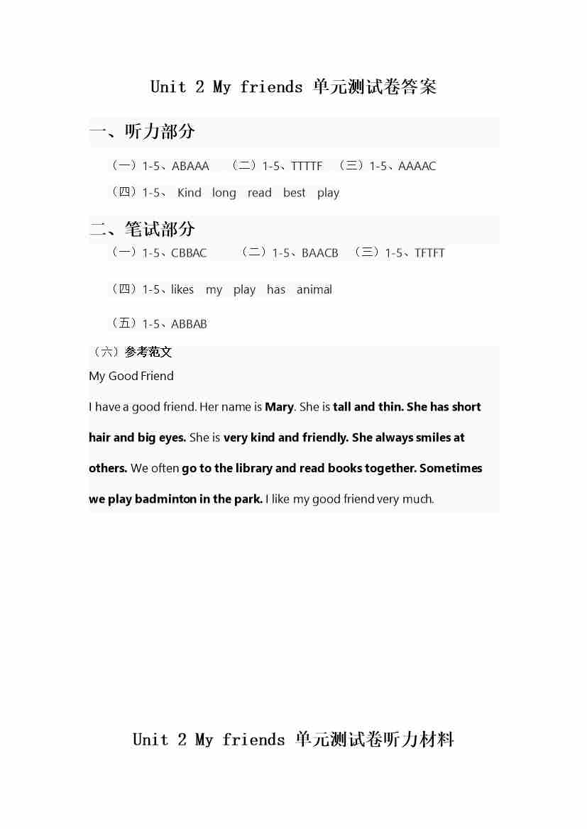 人教版四年级上册英语试卷 Unit 2答案