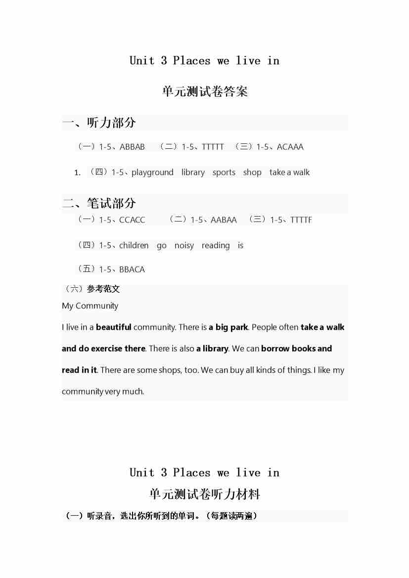 人教版四年级上册英语试卷 Unit 3答案