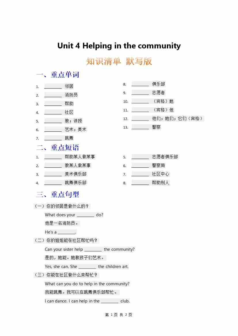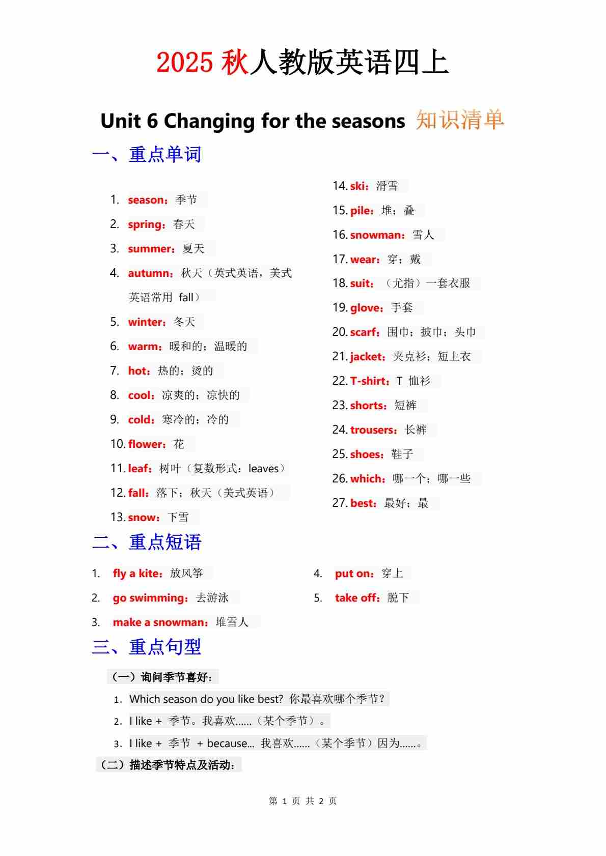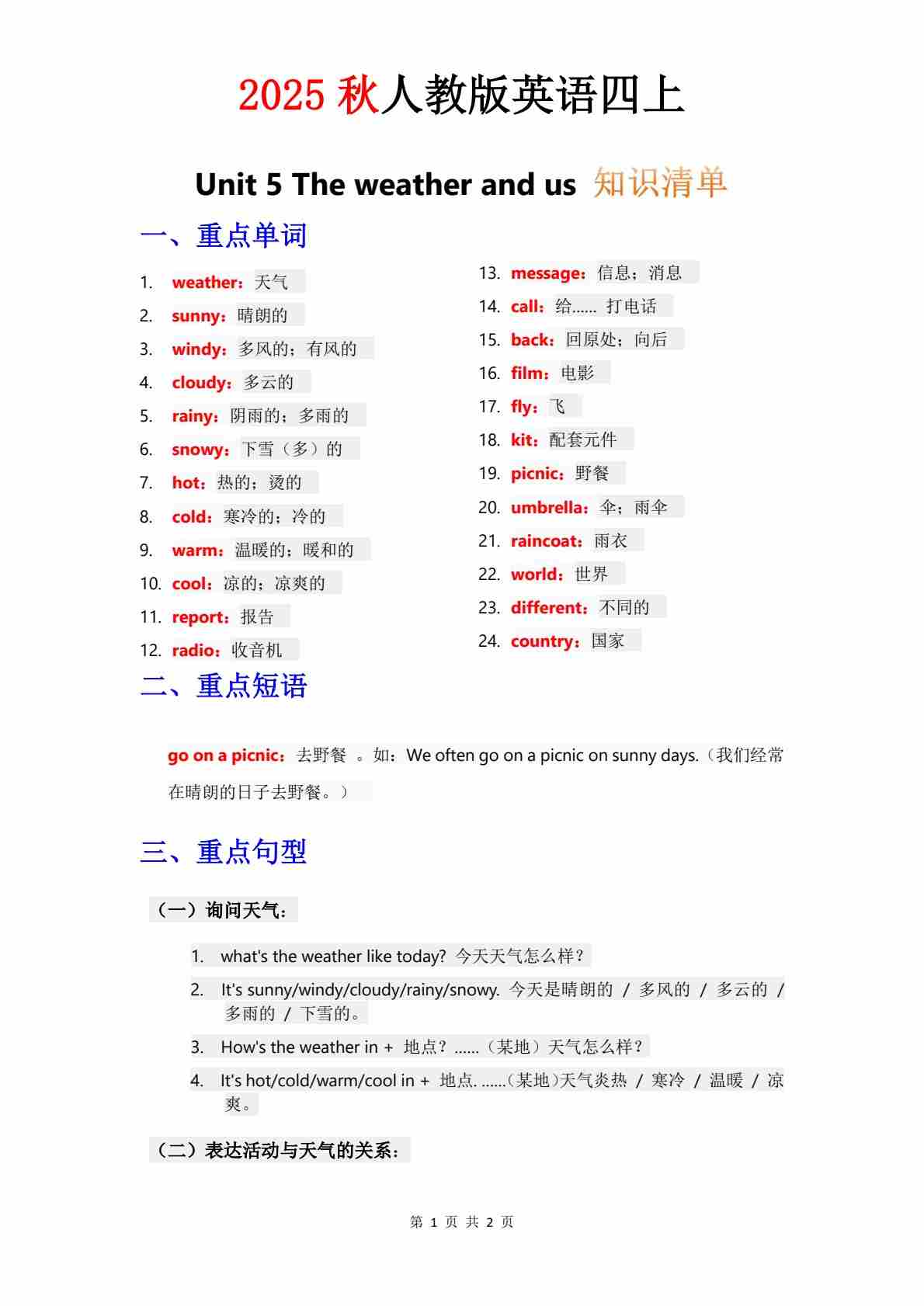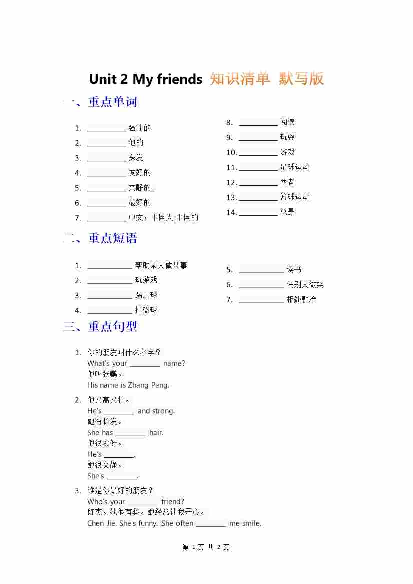 知识清单 Unit 2 默写版