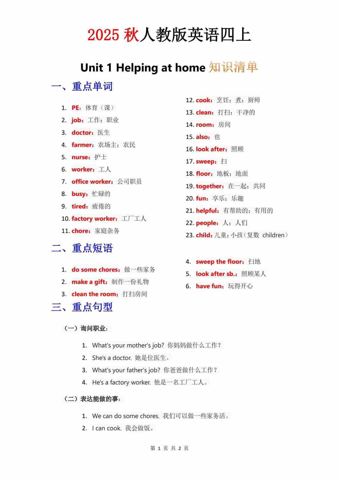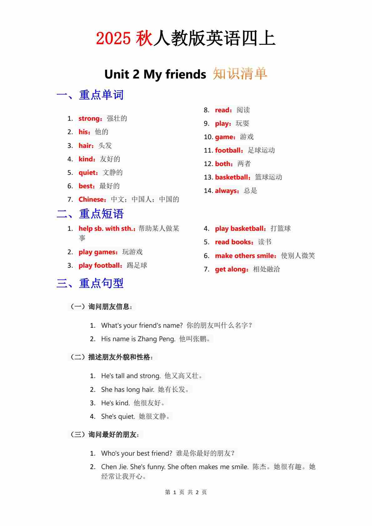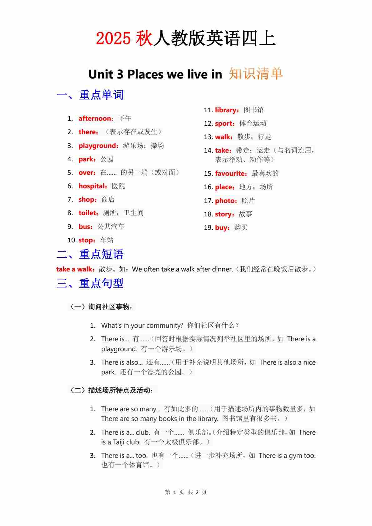 知识清单 Unit 2 默写版