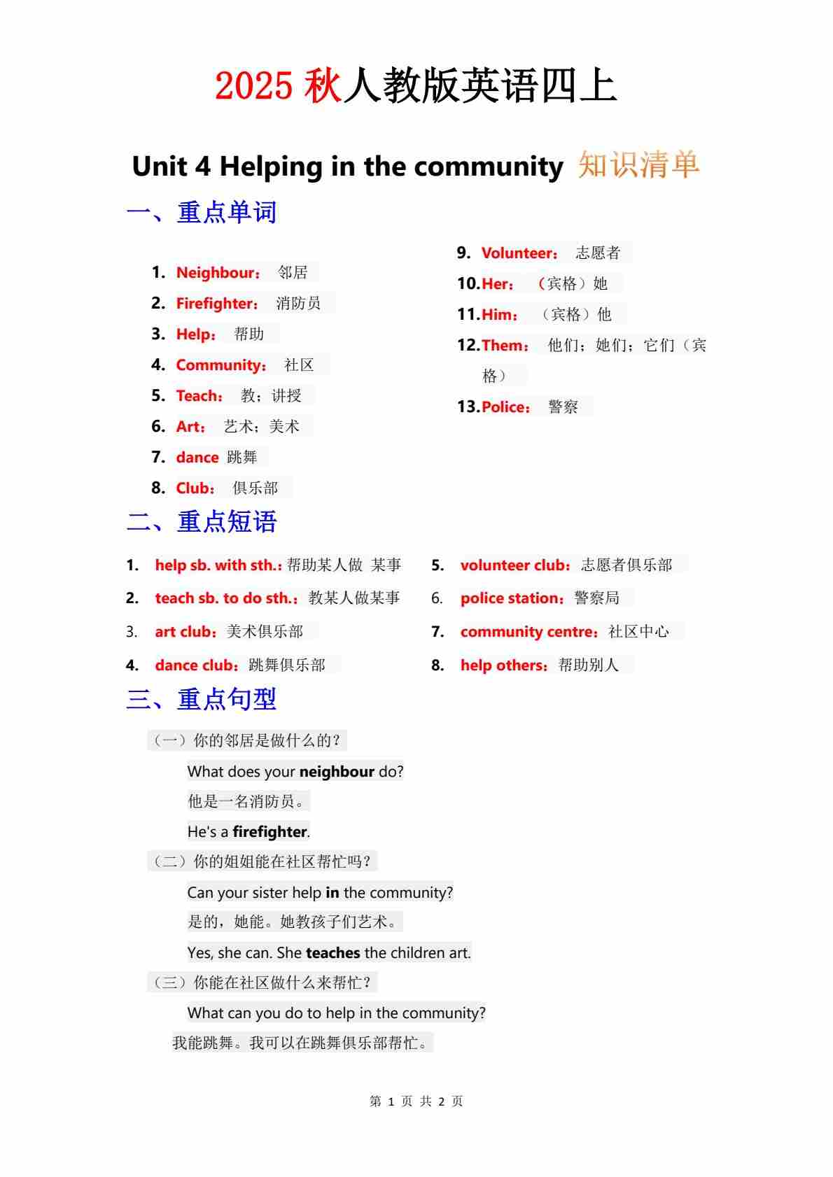 知识清单 Unit 2 教师版