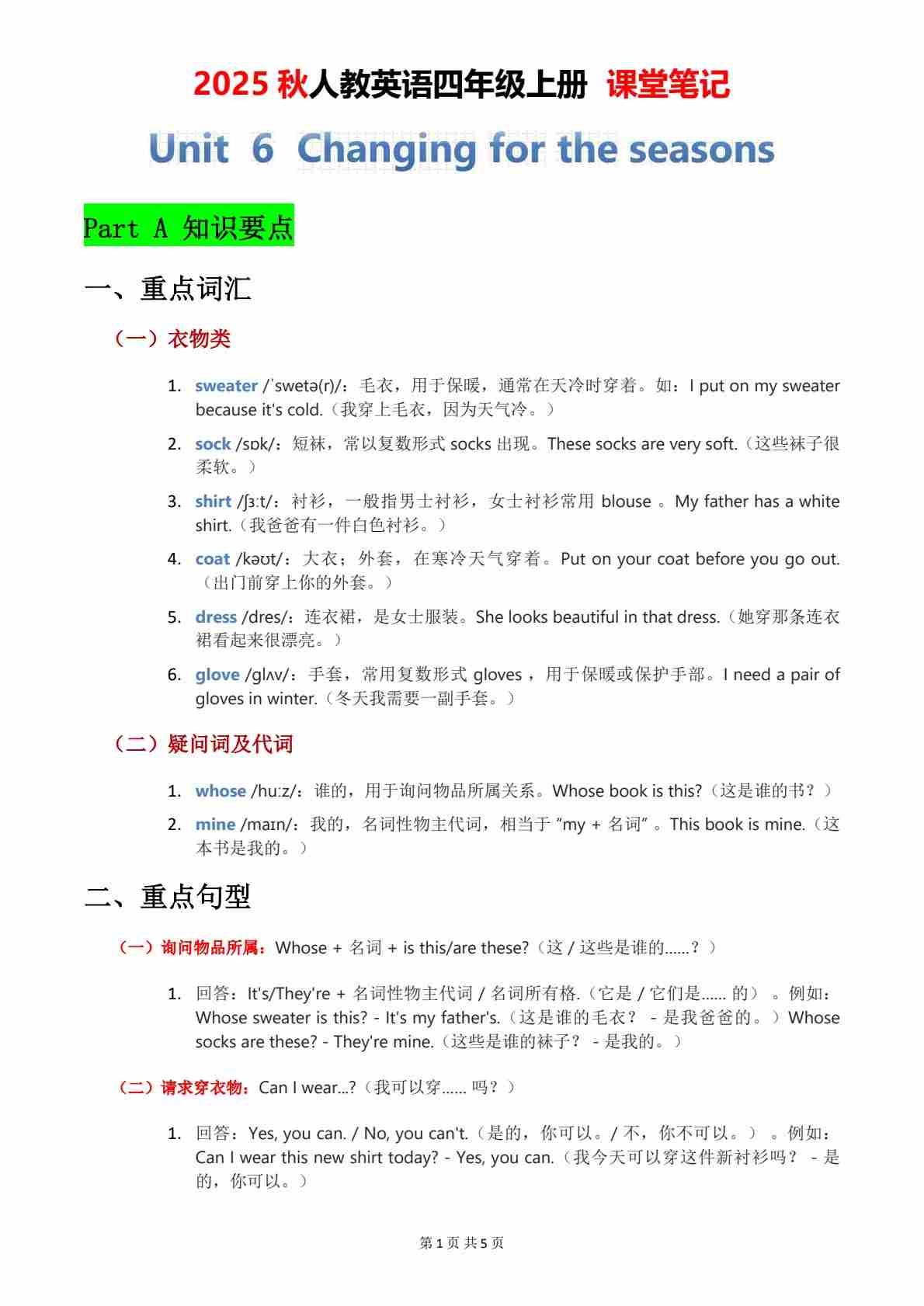 2025秋人教版四年级上册英语课堂笔记Unit 6