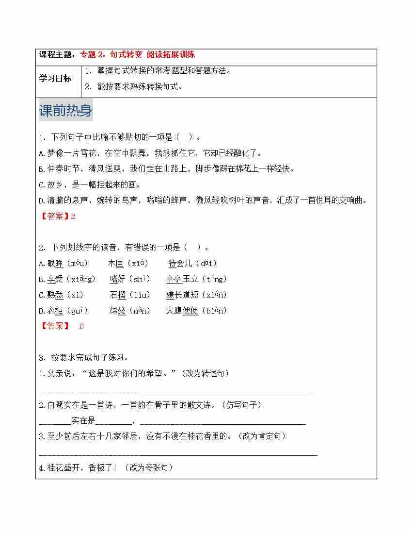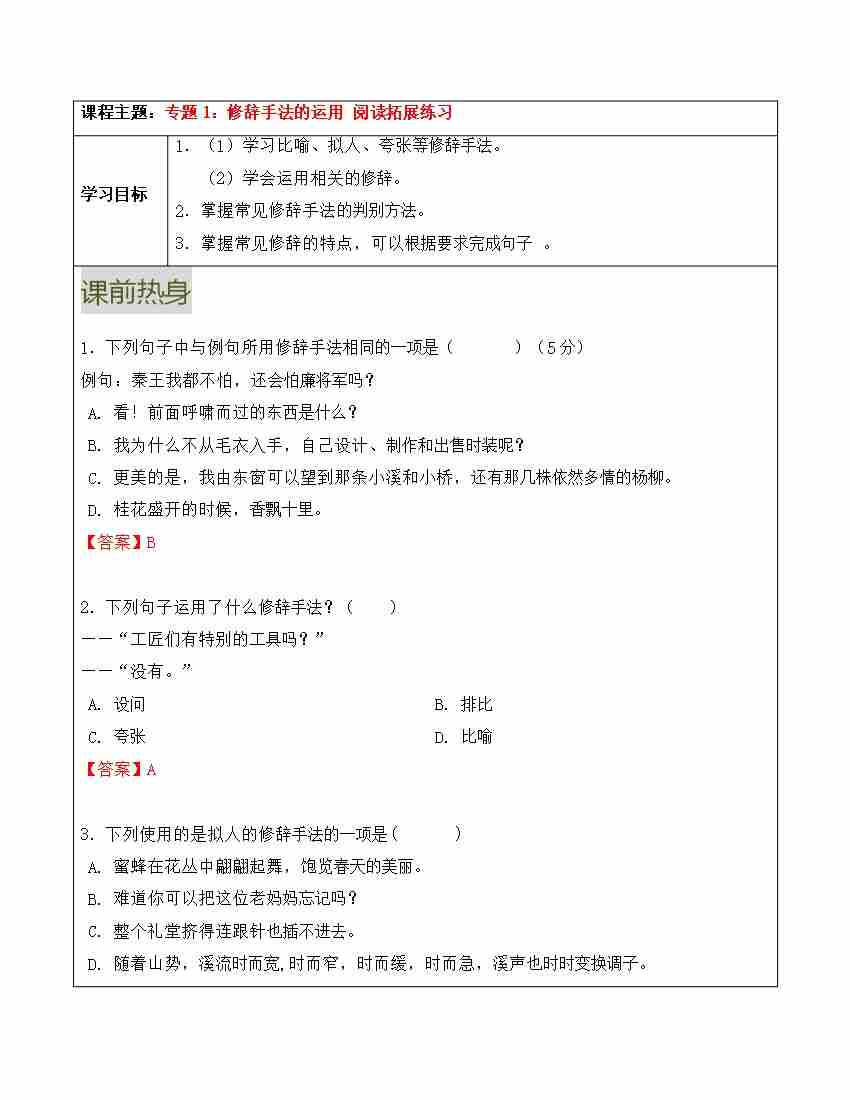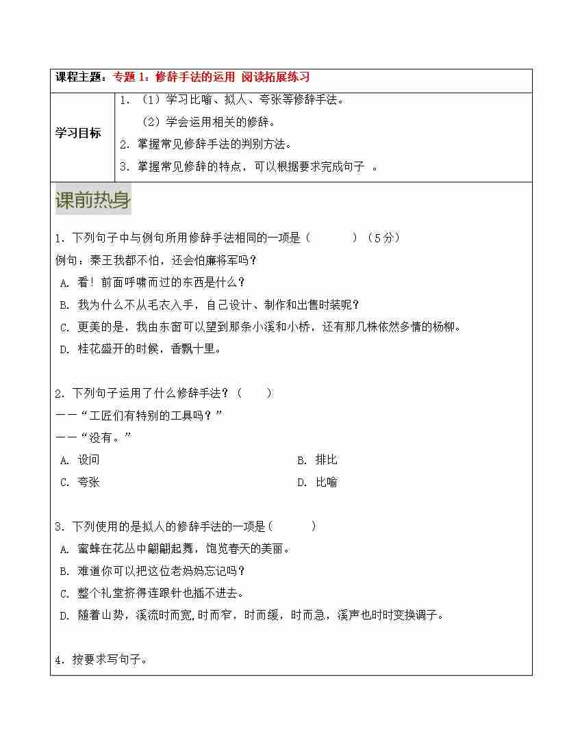 专题1:修辞手法的运用 阅读拓展练习(教师版)