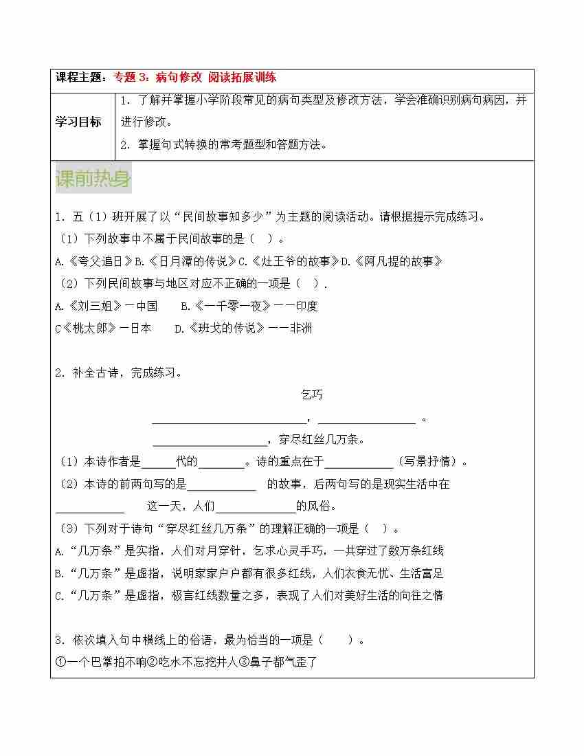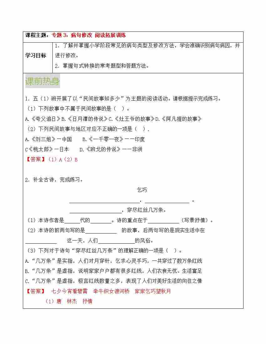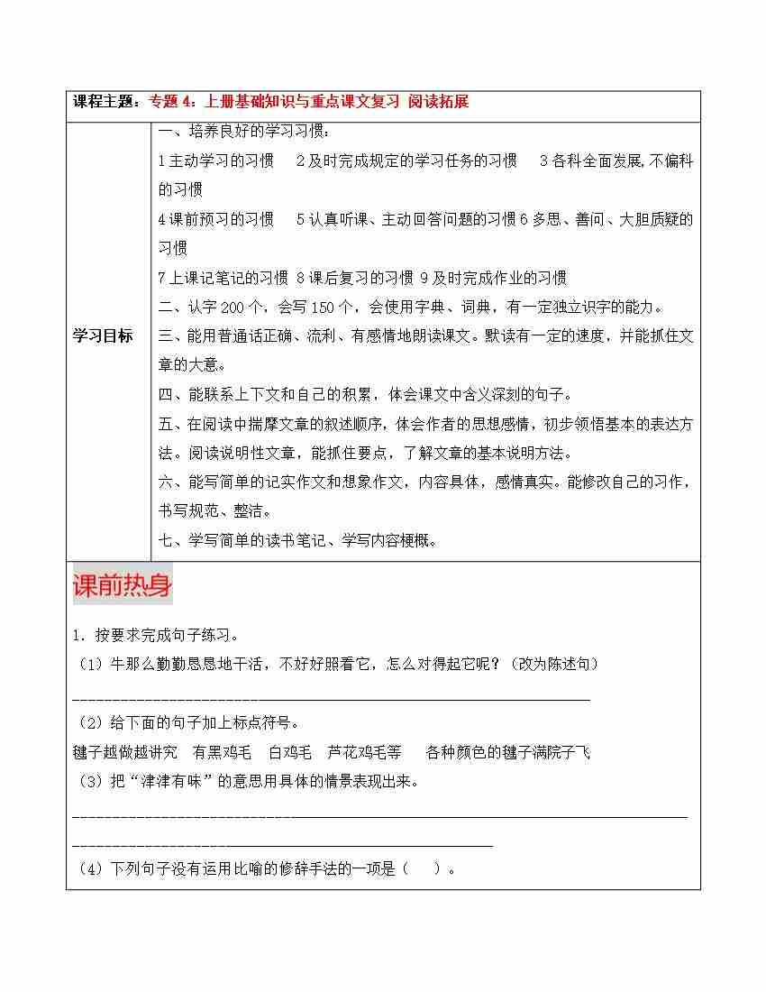 专题4:上册基础知识与重点课文复习 阅读拓展(教师版)