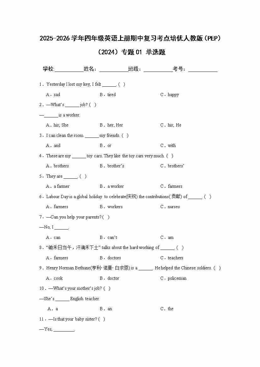 专题01 单选题-2025-2026学年四年级英语上册期中复习考点培优人教版(PEP)(2024)(含答案解析)